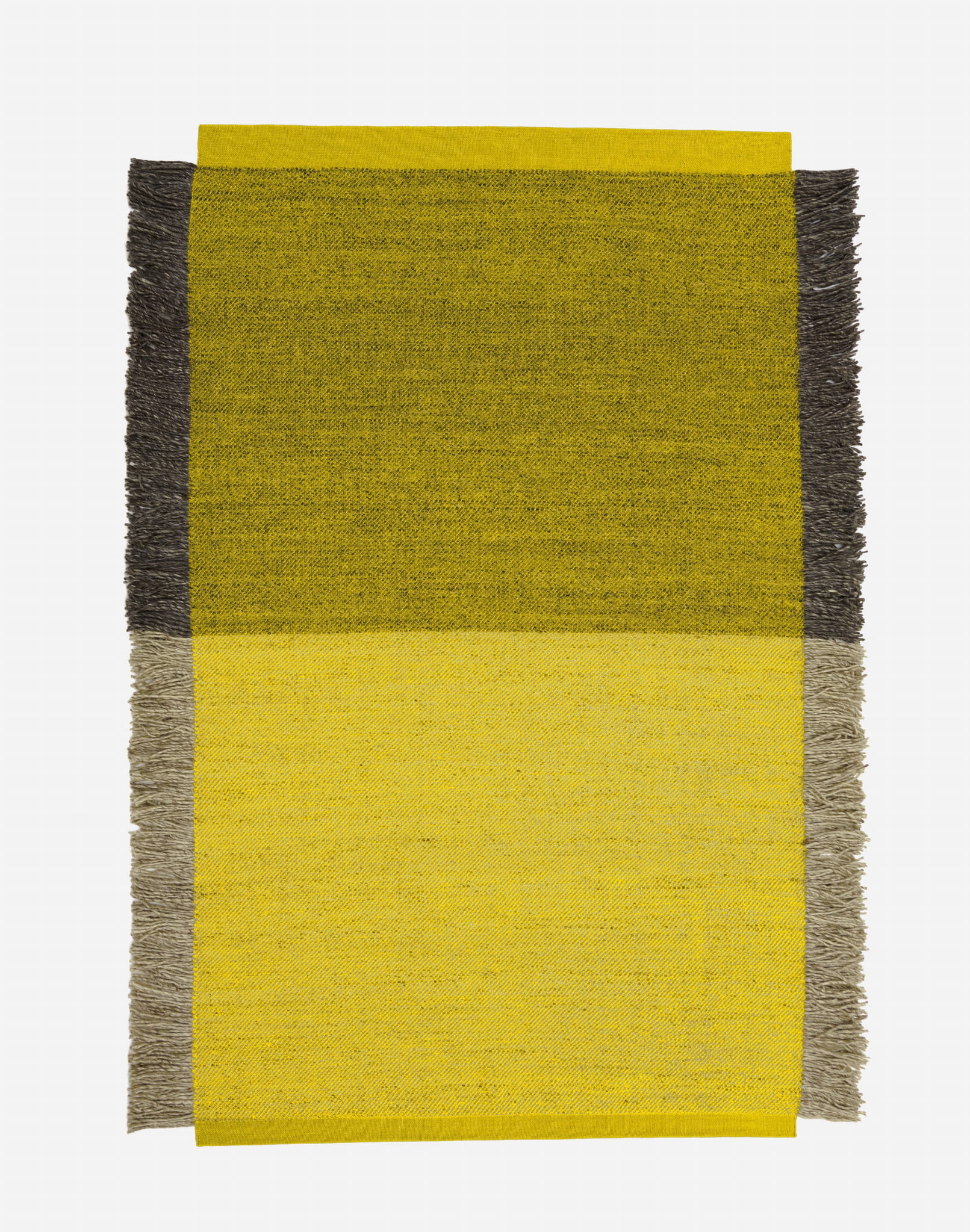Surowe odcienie szarości są widoczne na krawędziach wzoru w postaci wyczuwalnych w dotyku, długich frędzli, od których pochodzi nazwa dywanu.