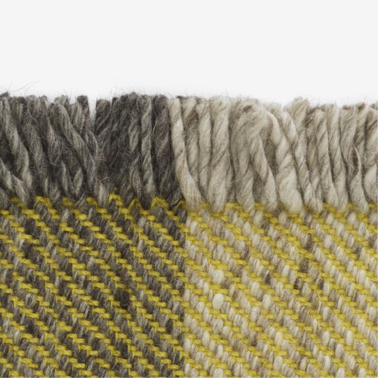 Fringe powstaje poprzez splatanie przędzy wełnianej o jaskrawych kolorach z dwoma różnymi odcieniami szarości - węglem drzewnym i jaśniejszym kolorem dymu. Rezultat jest na przemian odważny i niedopowiedziany, ponieważ podstawowe kolory łączą się w monochromatyczne bloki.