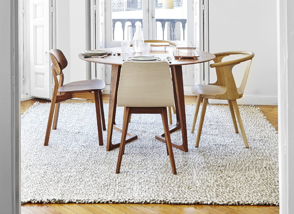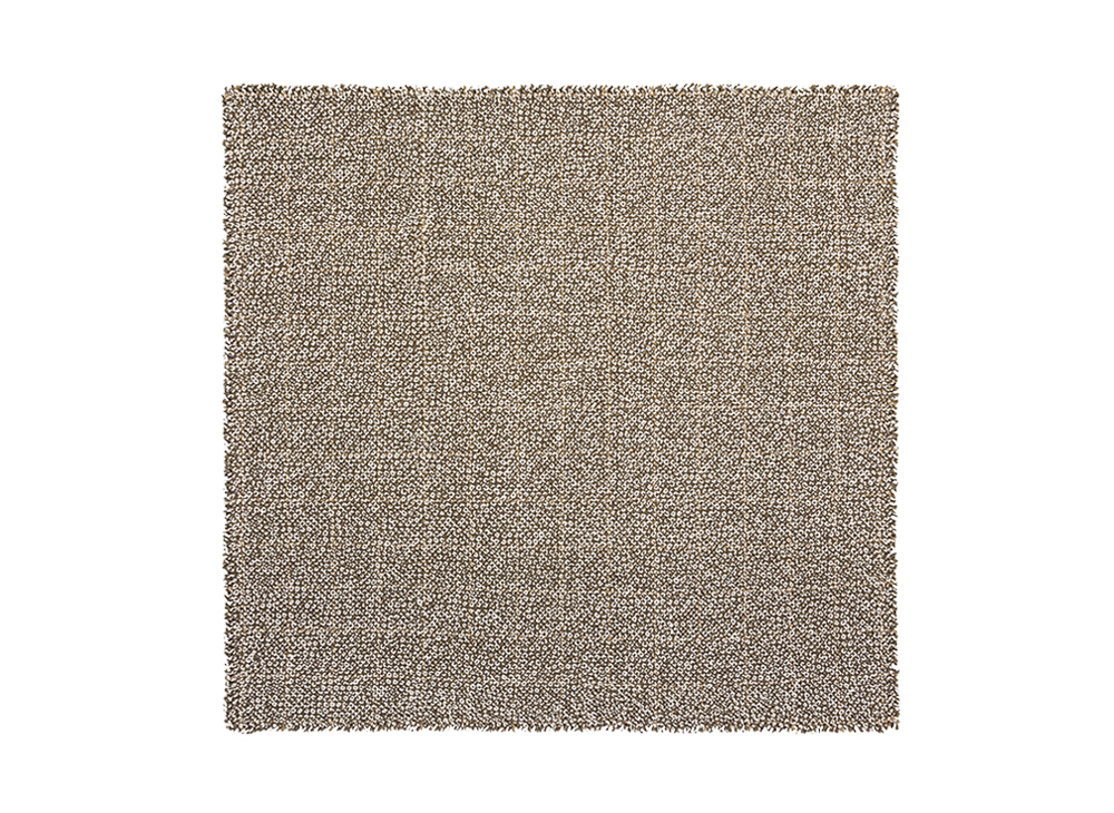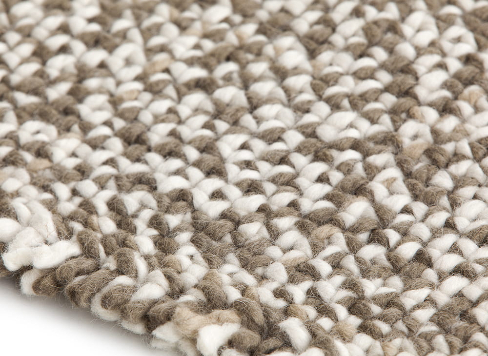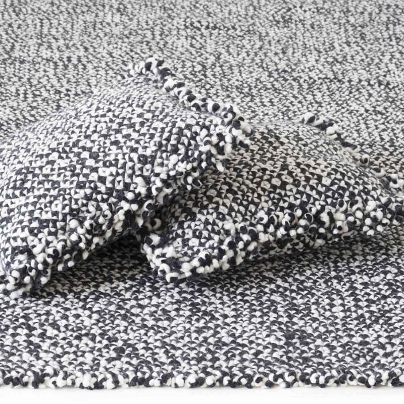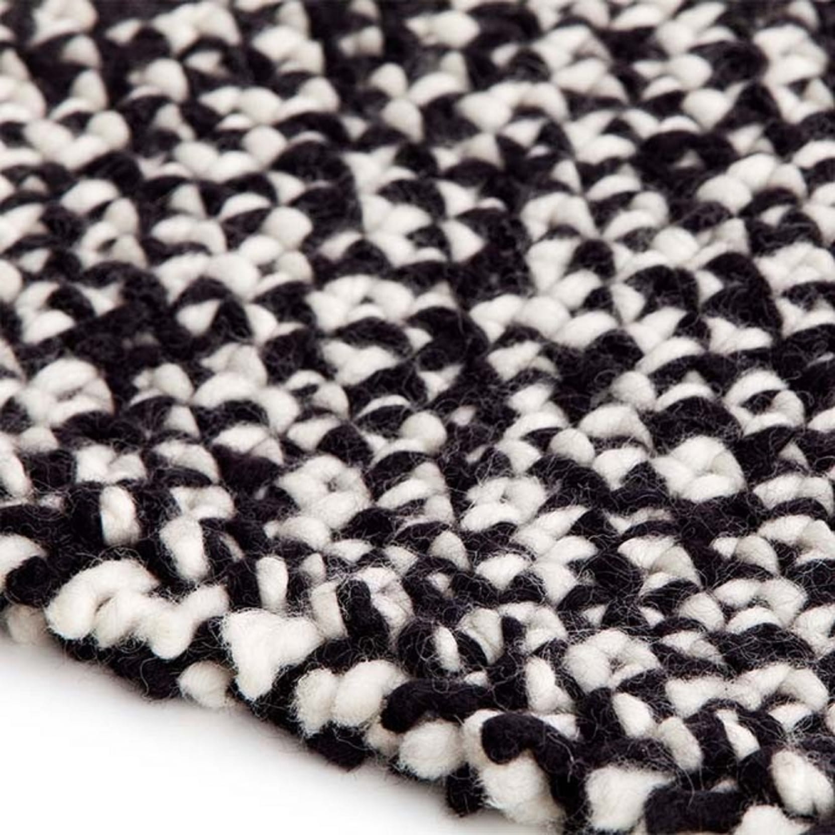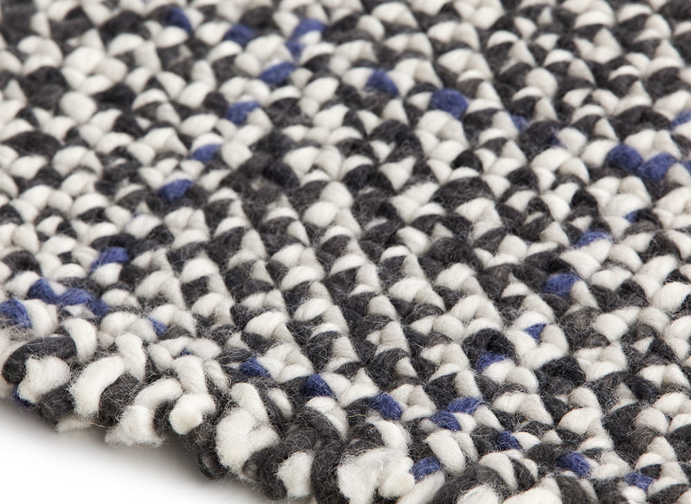 Choć wygląda jak dywanik węzełkowy, w rzeczywistości ten wzór został wykonany na krośnie. Jest to wzór Black & White z naszej kolekcji Waan, wykonany z bardzo grubej dwukolorowej przędzy powstałej przez skręcenie ze sobą czarnych i białych nici wełnianych. Dzięki zastosowaniu tych grubych przędz na krośnie powstała ta innowacyjna tkanina, która wygląda jak ciąg węzłów. Dostępny jest w trzech rozmiarach.