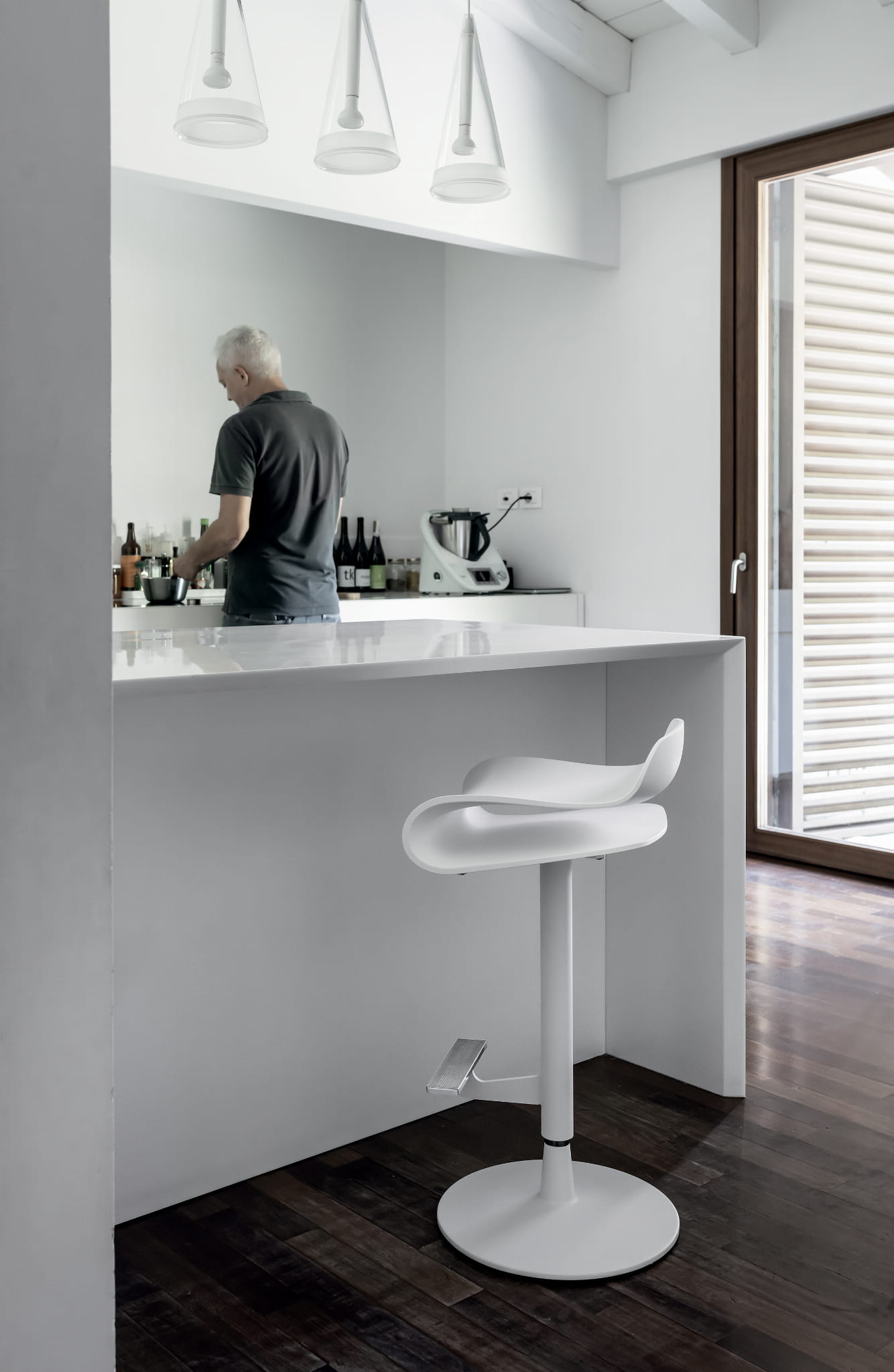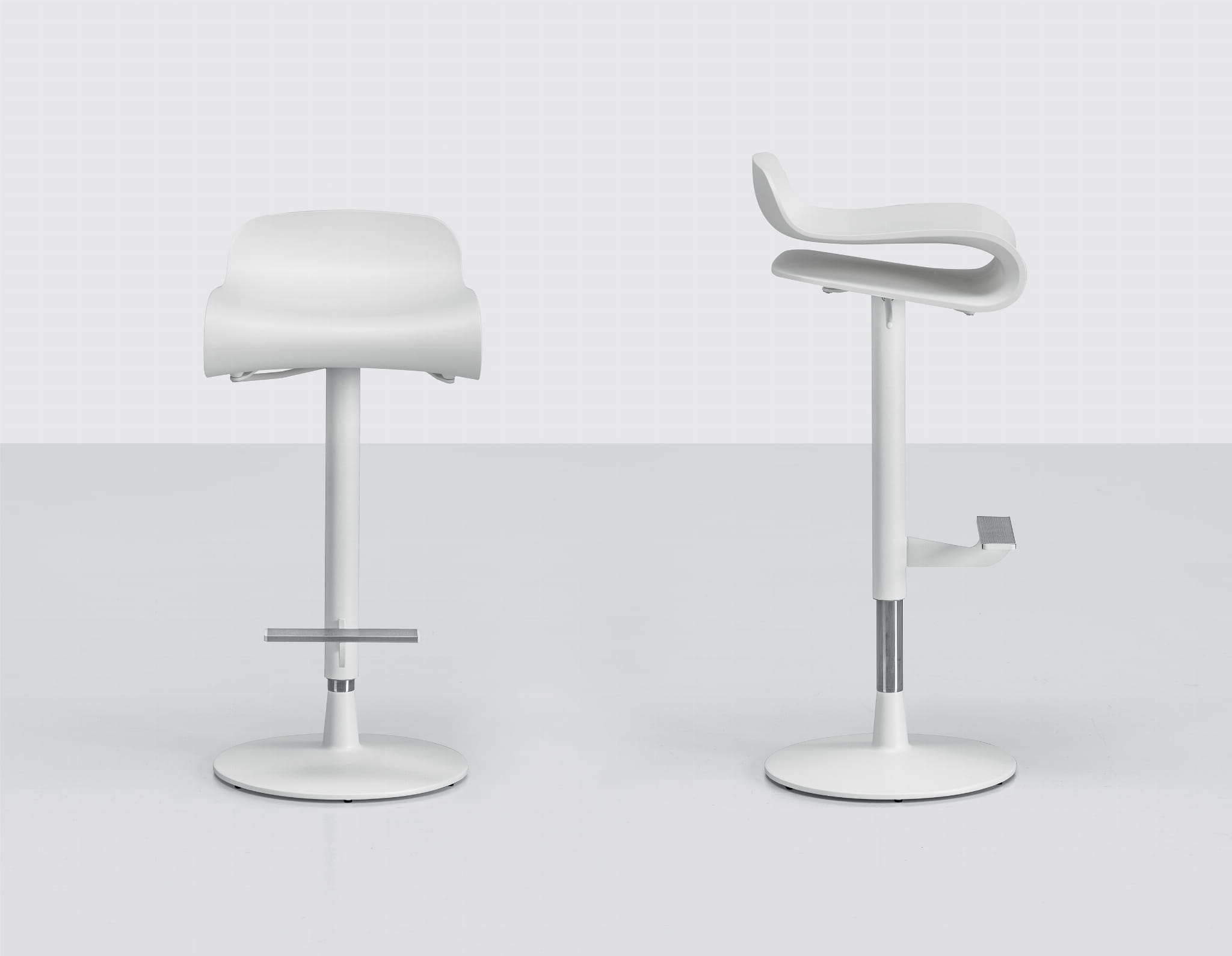 Doprowadziło to do powstania jednego z naszych kultowych produktów, stołka, który jest teraz dostępny w różnych wersjach: wysokiej, średniej lub niskiej. Siedzisko i podstawy są dostępne w różnych kolorach.