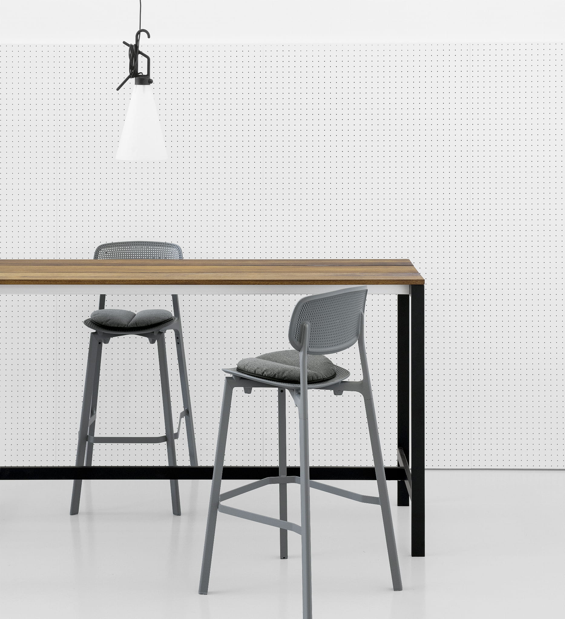 Colander przekłada na krzesło innowacyjną kreatywność Patricka Norgueta, francuskiego projektanta, który koncentruje się na rozwoju materiałów i technologii. Lekka i niezmienna konstrukcja z malowanego aluminium podtrzymuje siedzisko i oparcie, dostępne w trzech wersjach: oryginalna wersja z formowanego wtryskowo polipropylenu o perforowanym splocie przypominającym durszlak, stąd nazwa krzesła, oraz dwie nowe wersje drewniane, wygięte i tapicerowane tkaniną lub skórą. Możliwość sztaplowania, jedno- lub dwukolorowe, dzięki szerokiemu wyborowi wykończeń, krzesła Colander mogą być używane w najróżniejszych wnętrzach i na zewnątrz, w domu lub w społeczności lokalnej.