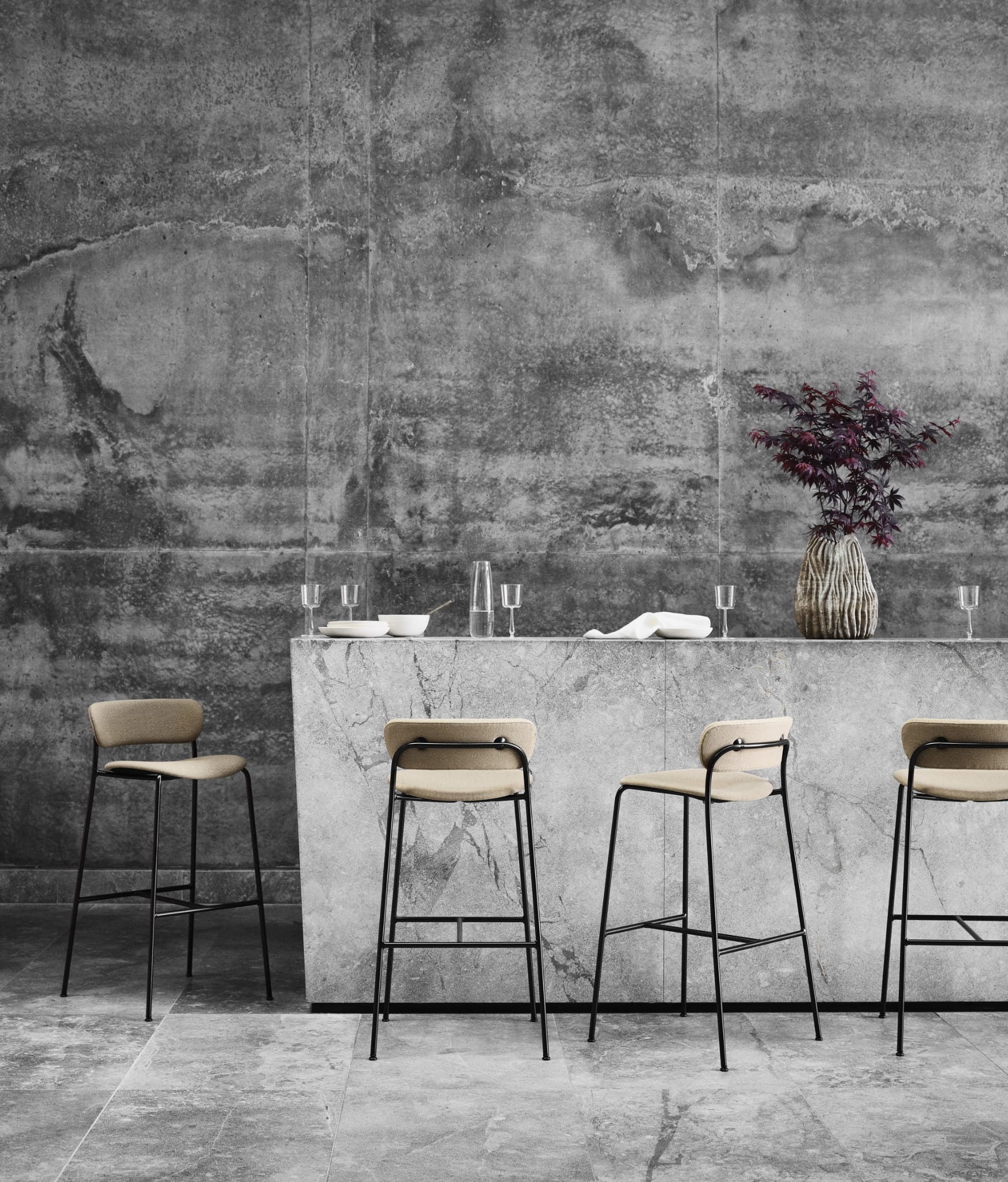 Krzesło barowe i kontuarowe Pavilion sprawia wrażenie zwiewnego. Płynne krzywizny fornirowanego drewnem siedziska i oparcia kontynuują liryczne linie w stalowych rurkach nóg. W rezultacie uzyskano sylwetkę, której prawie nie widać. Idealnie nadają się do wyposażenia obszernego baru lub lady kuchennej, nie sprawiając przy tym wrażenia zatłoczonych, mogą z łatwością wypełnić przestrzeń, nie sprawiając przy tym wrażenia przepełnienia. "Krzesła rurowe miały swój początek we wczesnym modernizmie, ale zazwyczaj były skonstruowane pod stałym kątem" - zauważa Anderssen & Voll. "Chcieliśmy odkryć bardziej otwartą konstrukcję, swobodniejszą formę wyrazu".