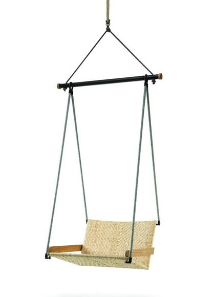 Huśtawka z drewna tekowego i naturalnego rattanu.