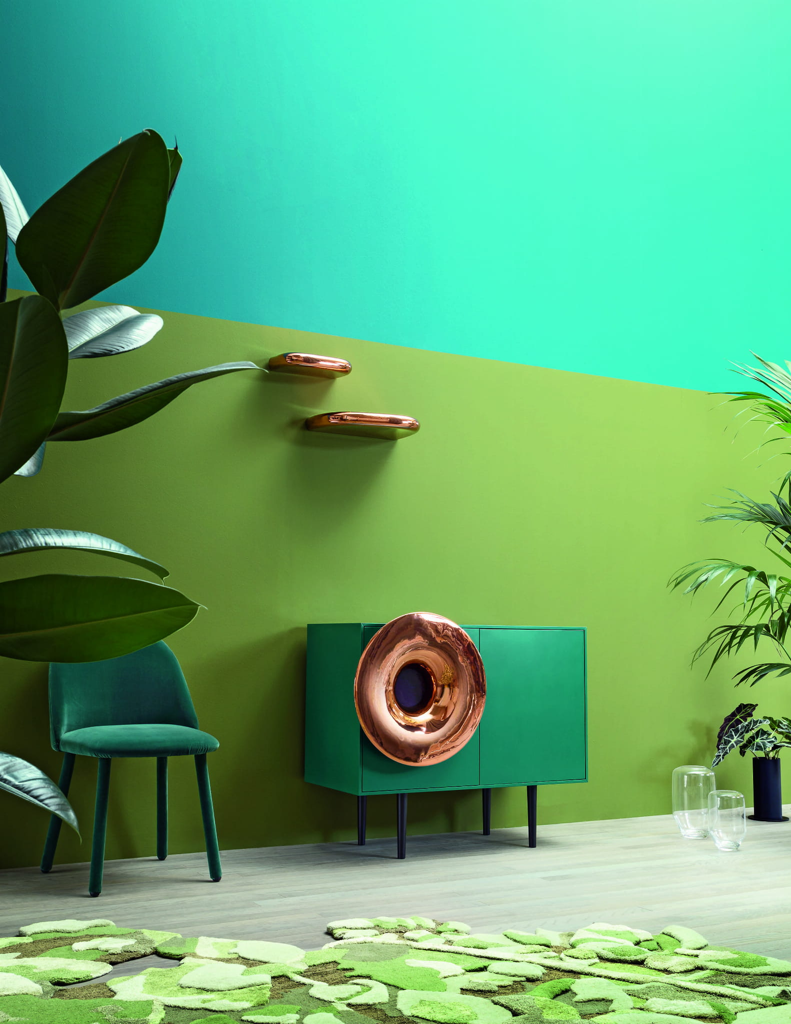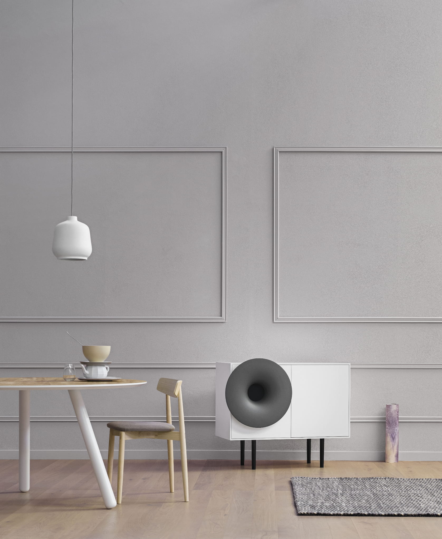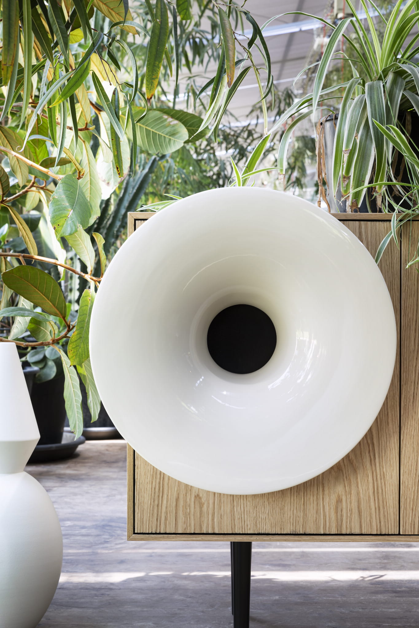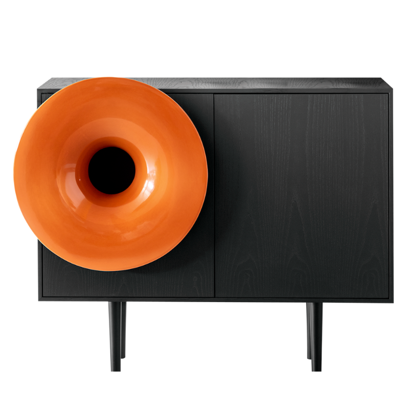 Szafka z wbudowanym systemem audio. Konstrukcja z drewna lub lakierowana w kolorach wymienionych w Campionario. Trąbka w kolorze miedzianym, złotym lub ceramicznym w kolorach wymienionych w Campionario. Dostępne w dwóch rozmiarach i z opcjonalnym oświetleniem LED z czujnikiem ruchu.