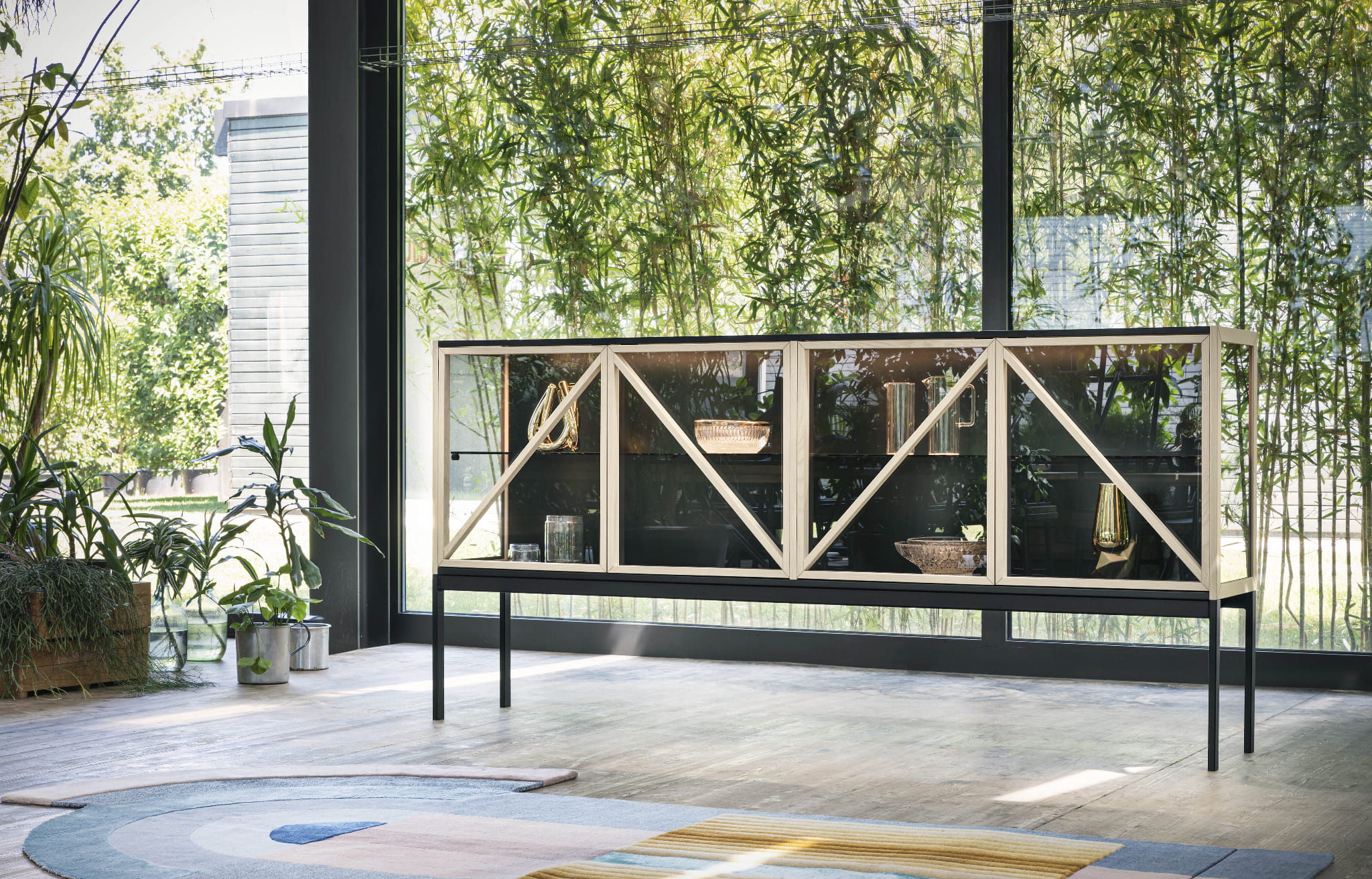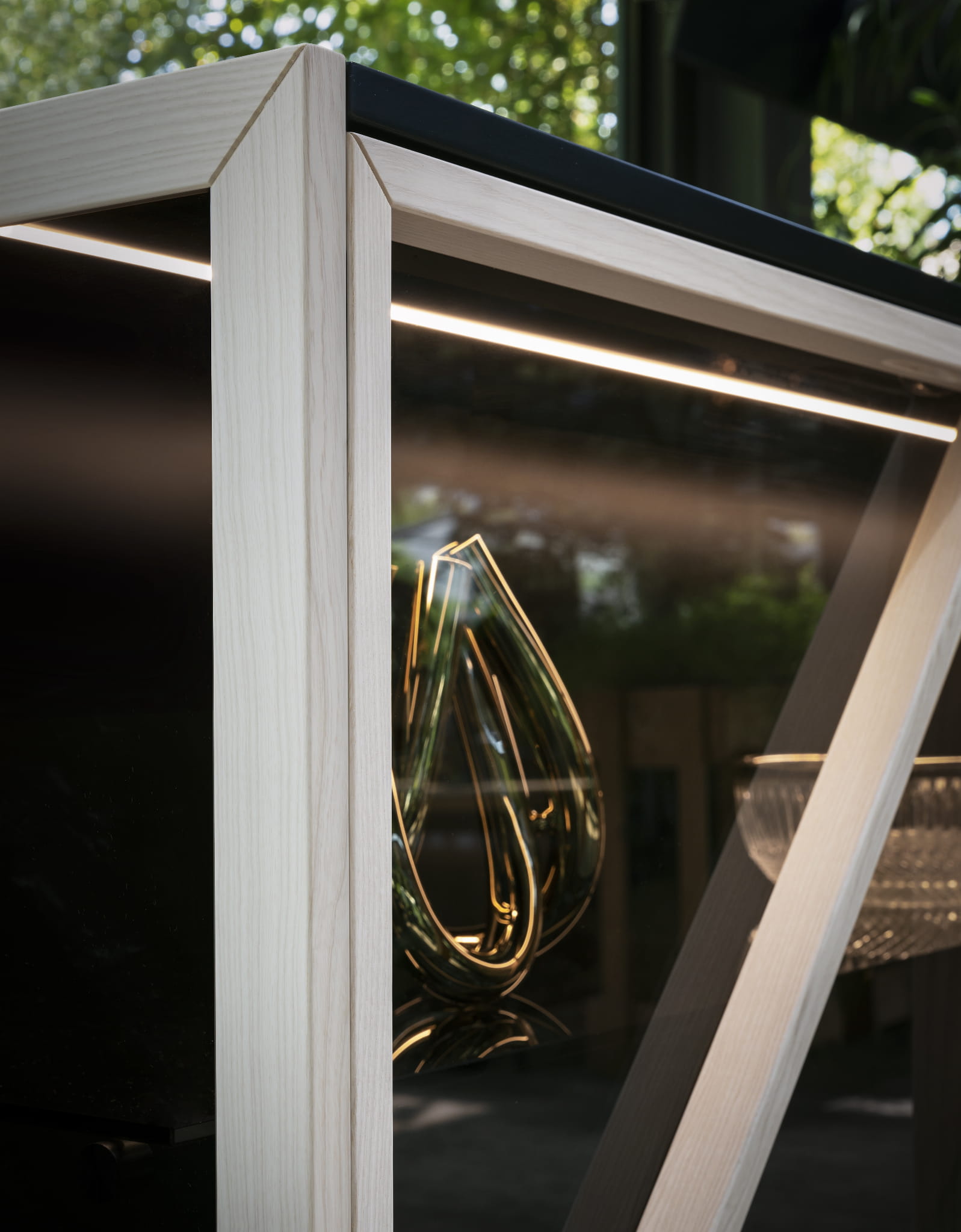 Witryna z drzwiami ze szkła Grey Europe i wewnętrznym oświetleniem ledowym. Rama z jesionu, orzecha barwionego na jesion lub czarnego jesionu. Podstawa lakierowana na czarno.