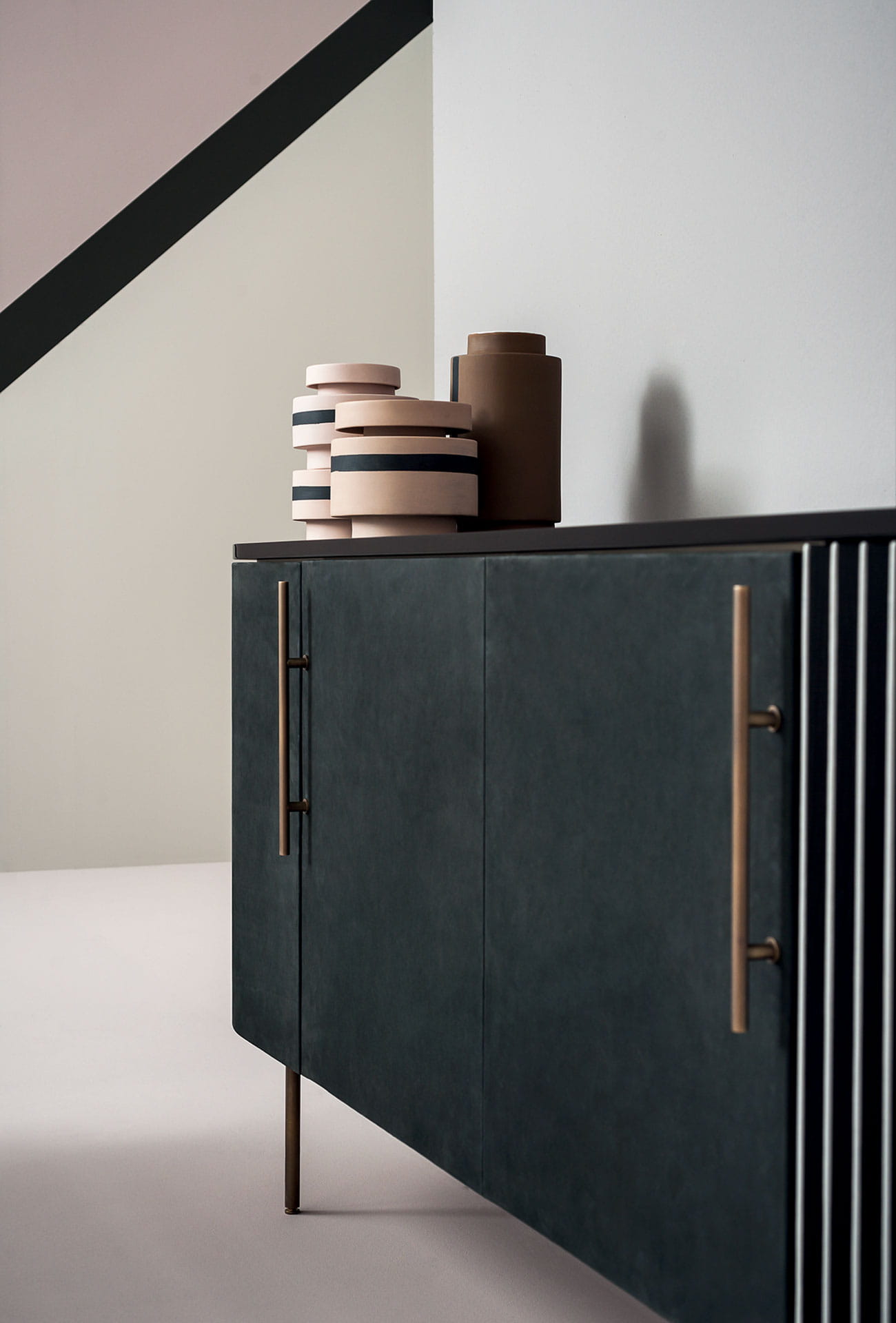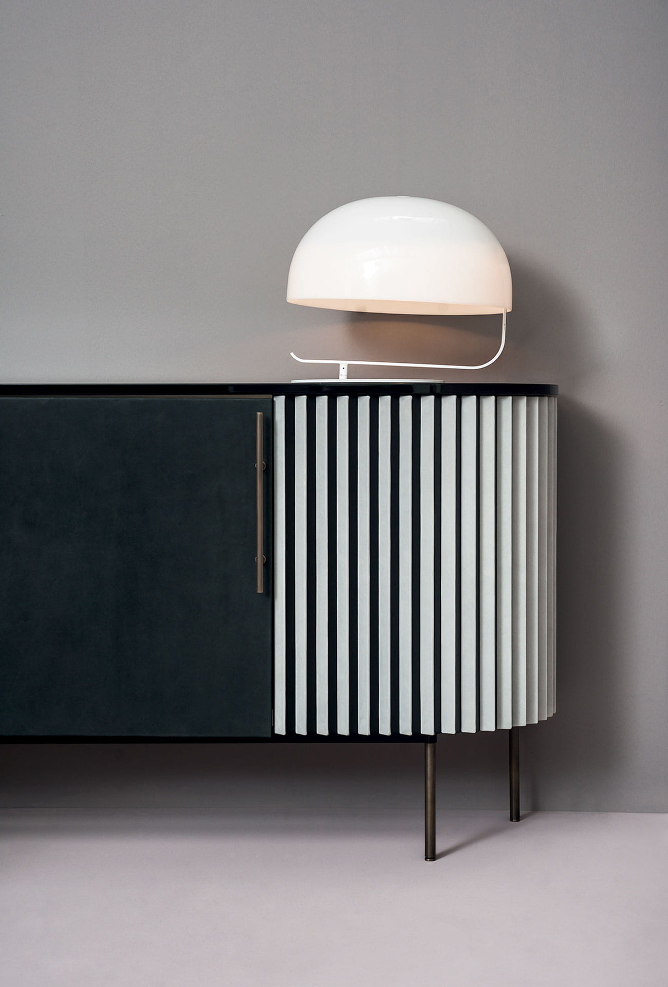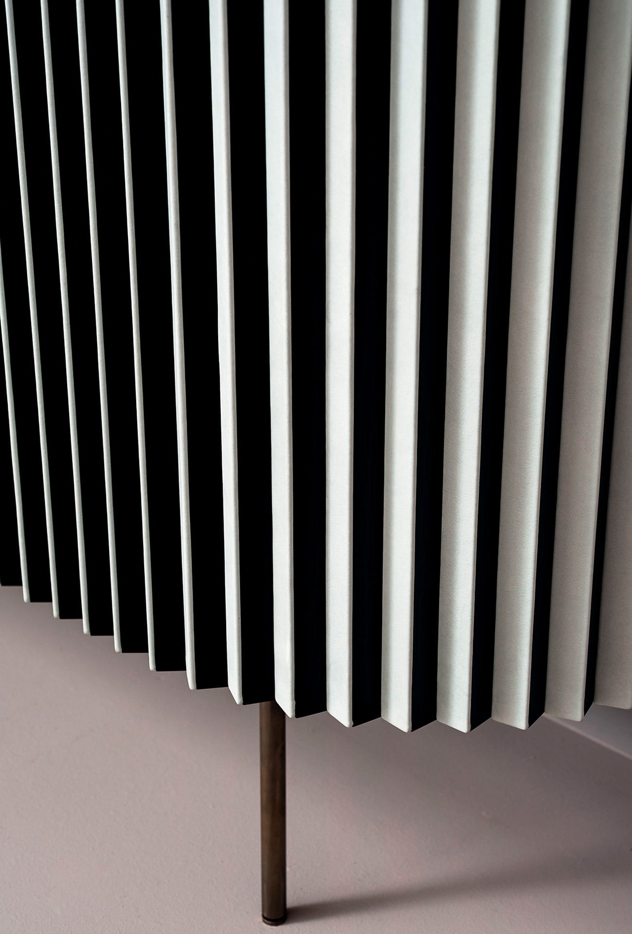 Podstawa z polerowanego mosiądzu. Wewnętrzna rama z MDF fornirowanego naturalnym klonem, z zewnętrznym tyłem z matowego dębu barwionego na czarno. Zakrzywiona żaluzja ze sklejki topolowej wewnętrznie fornirowanej czarnym dębem. Od zewnątrz jedna żaluzja pokryta jest skórą, a druga trójkątnym wzorem plissé. Ten wzór to matowy dąb barwiony na czarno z jednej strony i pokryty skórą z drugiej.