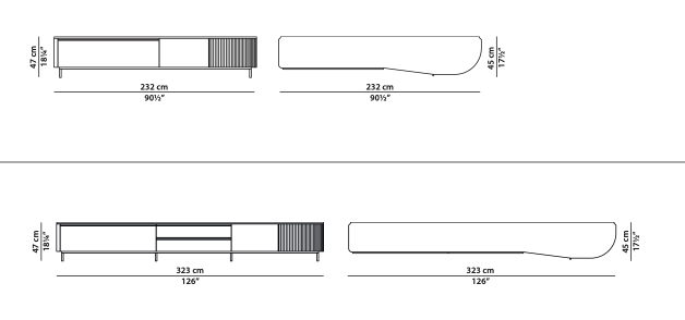 Podstawa z polerowanego mosiądzu. Wewnętrzna rama z MDF fornirowanego naturalnym klonem, z zewnętrznym tyłem z matowego dębu barwionego na czarno. Zakrzywiona żaluzja ze sklejki topolowej wewnętrznie fornirowanej czarnym dębem. Od zewnątrz jedna żaluzja pokryta jest skórą, a druga trójkątnym wzorem plissé. Ten wzór to matowy dąb barwiony na czarno z jednej strony i pokryty skórą z drugiej.