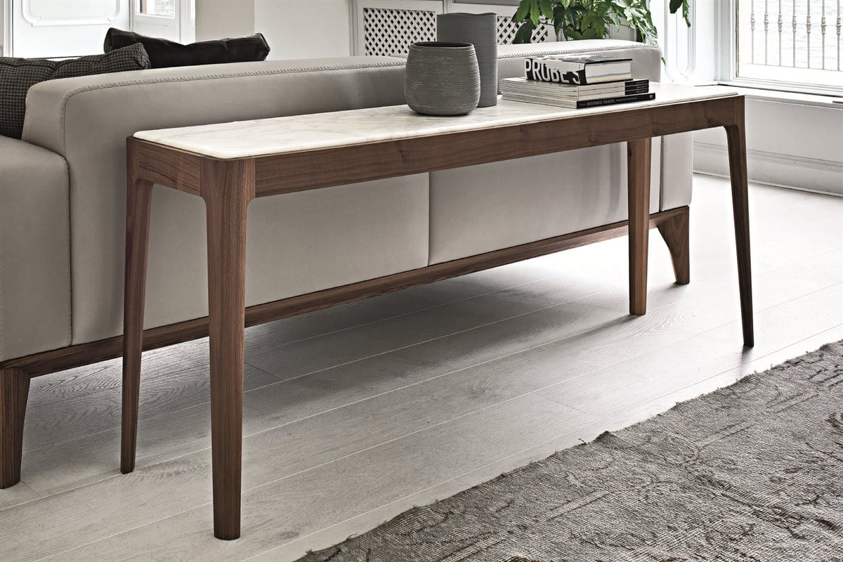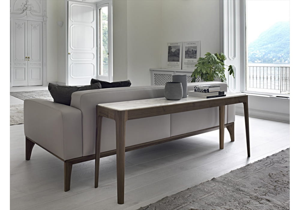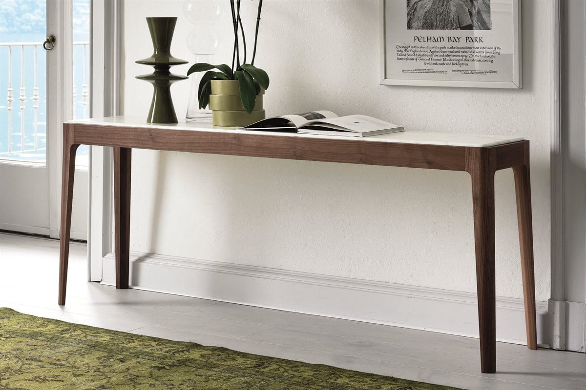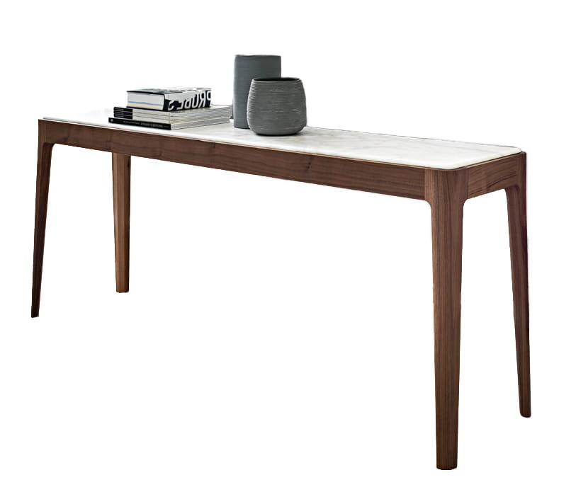 Konsola z ramą z litego orzecha canaletta lub jesionu i drewnianym blatem, blatem marmurowym lub blatem z matowego szkła pokrytego pleksiglasem.