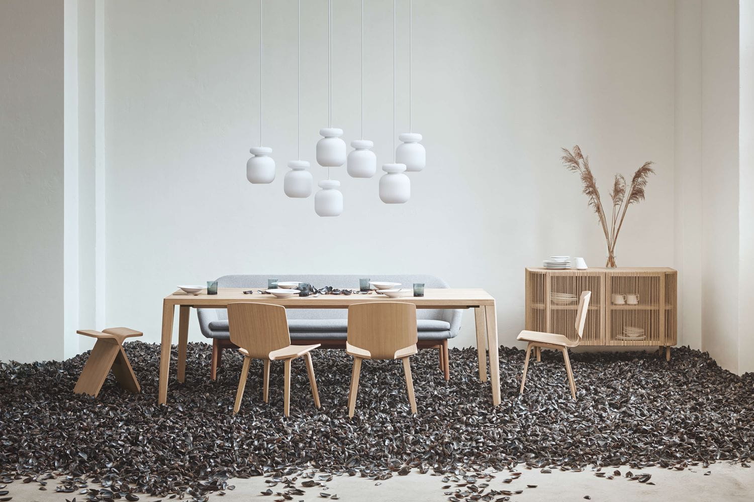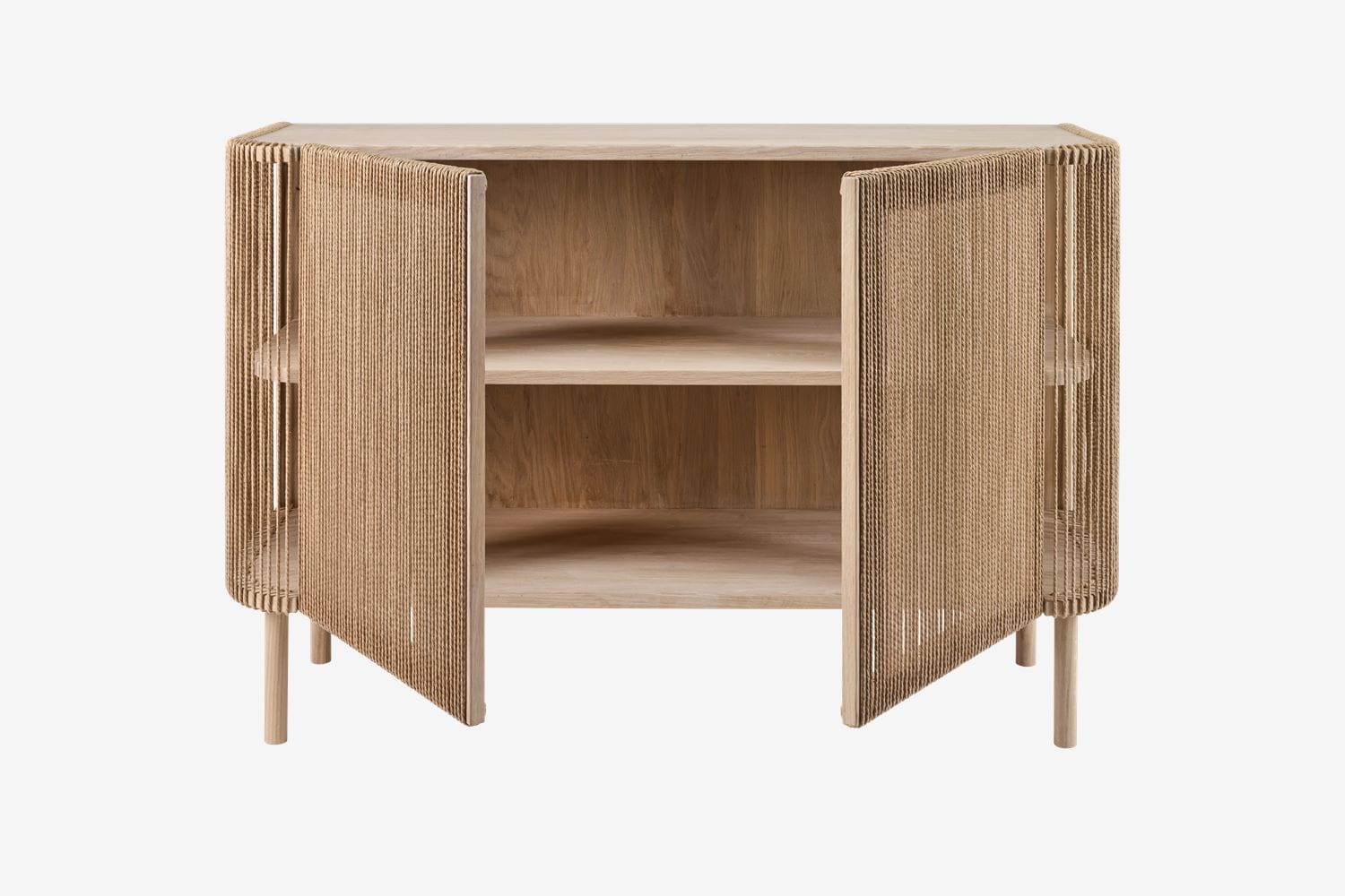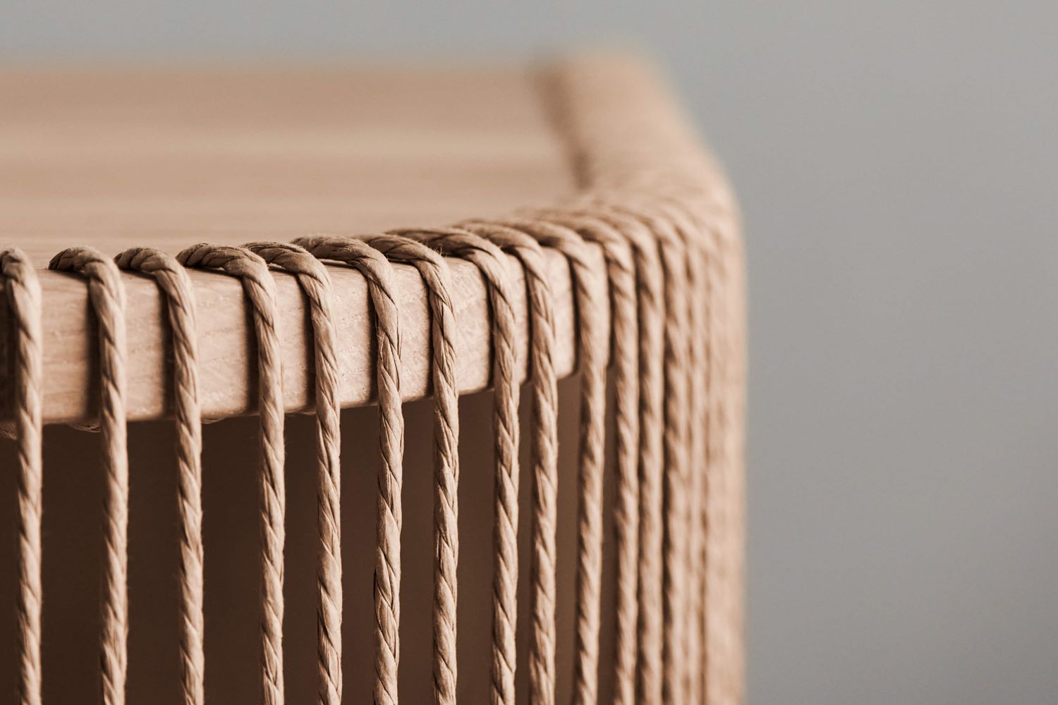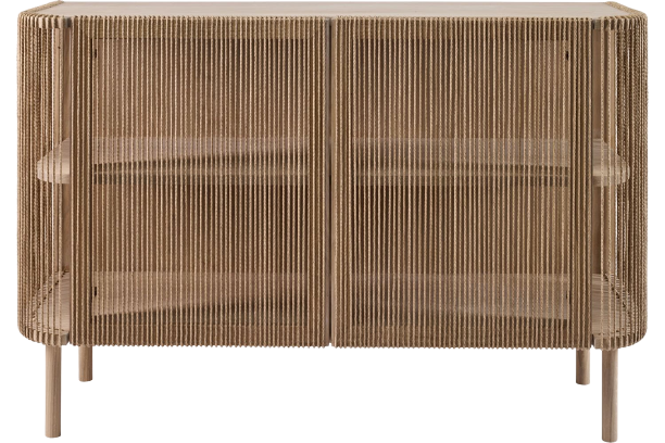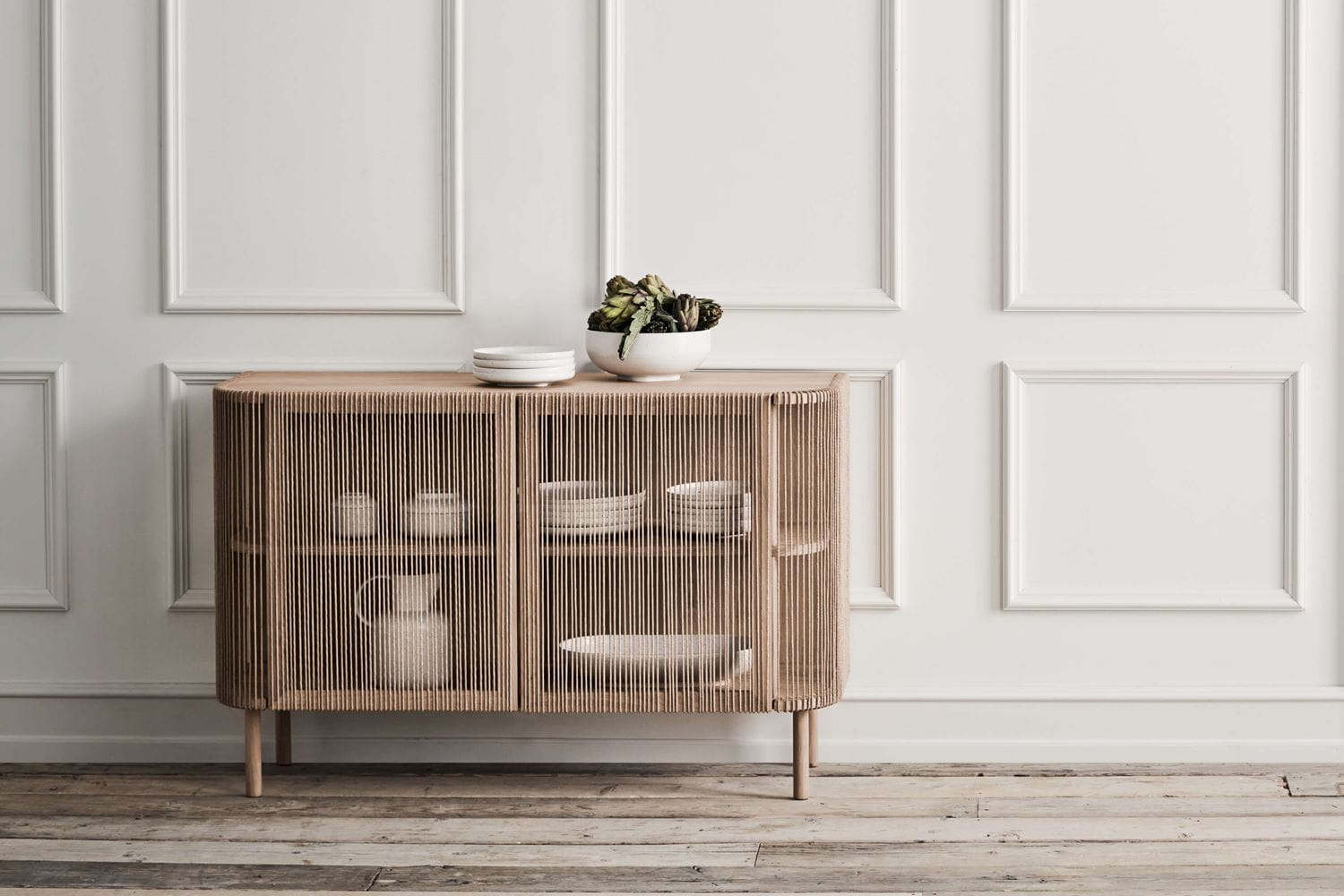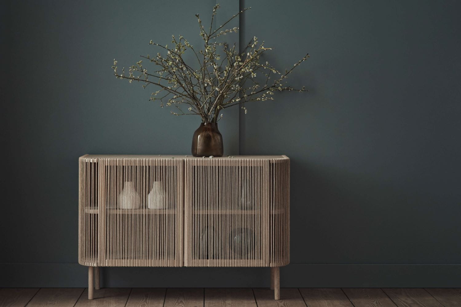 Kredens Cord jest wykonany z litego dębu, który tworzy ciężki i solidny kontur, kontrastujący z kolumnami plecionej papierowej liny, które tworzą przewiewny, przyciągający wzrok front. Cienki jak papier oplot jest z pewnością czymś wyjątkowym. Na pierwszy rzut oka papierowa lina może wydawać się zbyt słaba, ale przy bliższym przyjrzeniu się widzimy jej jakość. Duński Cord jest opracowywany i produkowany w małym duńskim miasteczku Randers, dzięki temu jest wykonany rzemieślniczo, z dbałością o szczegóły.