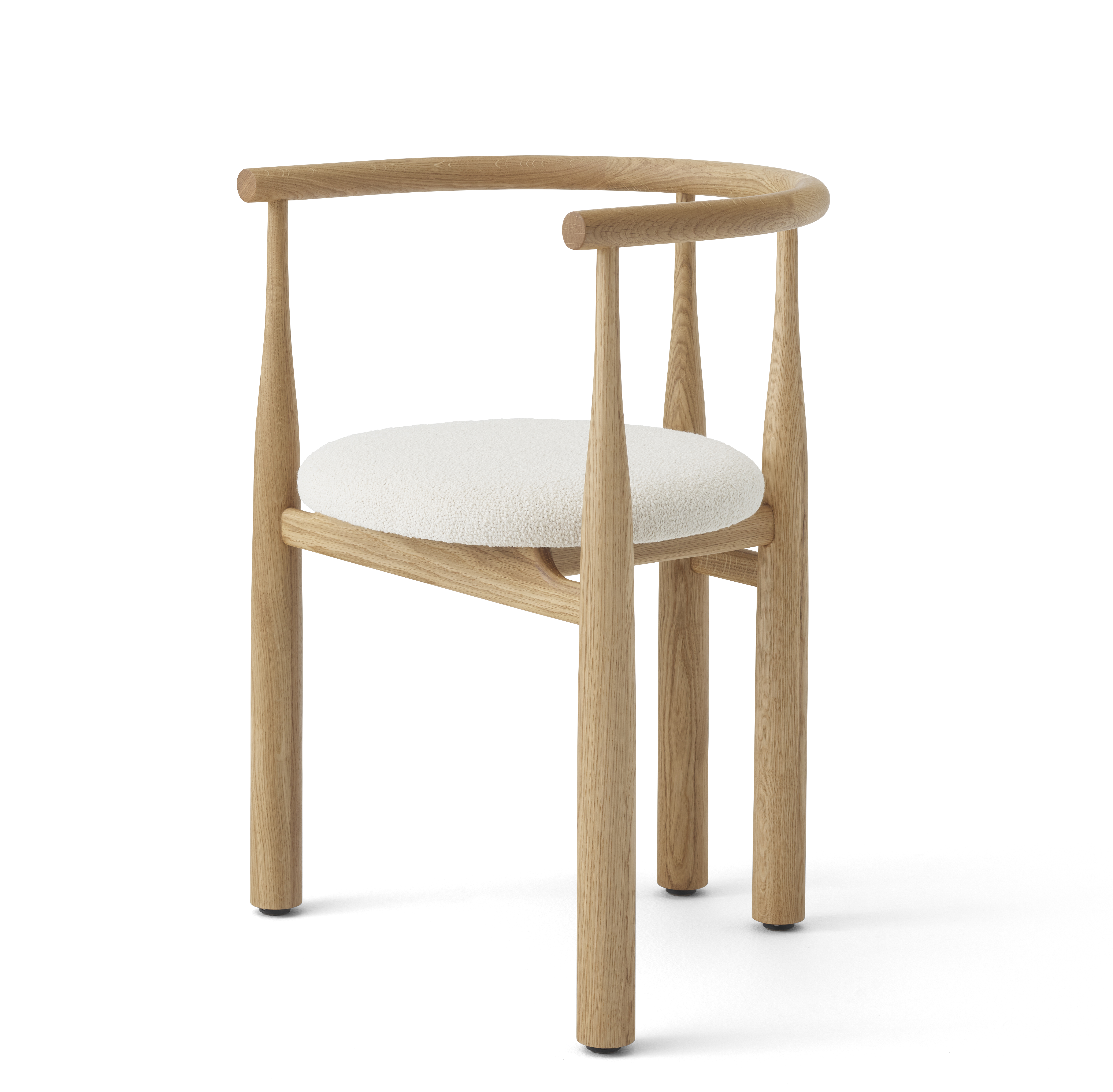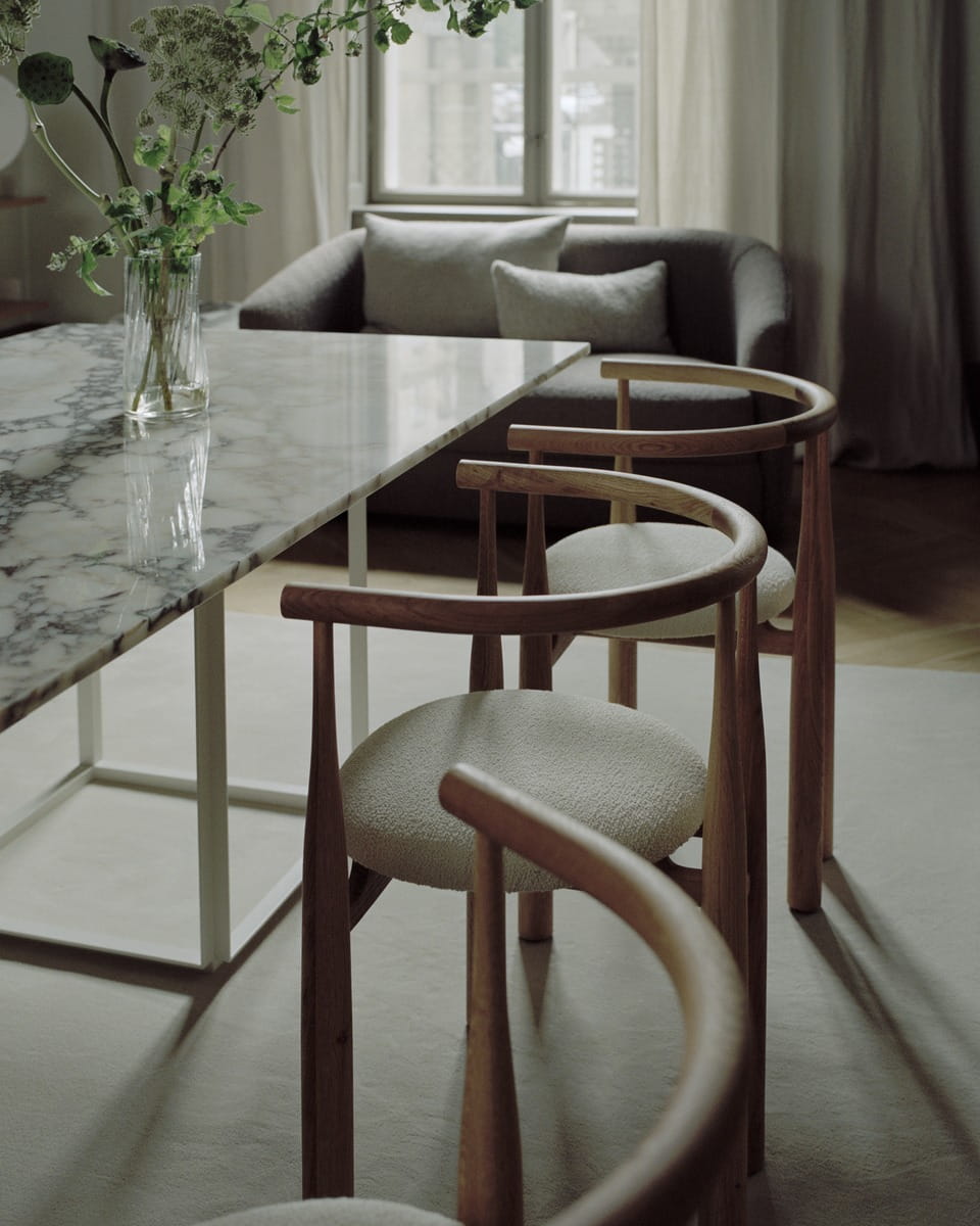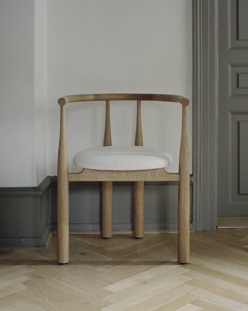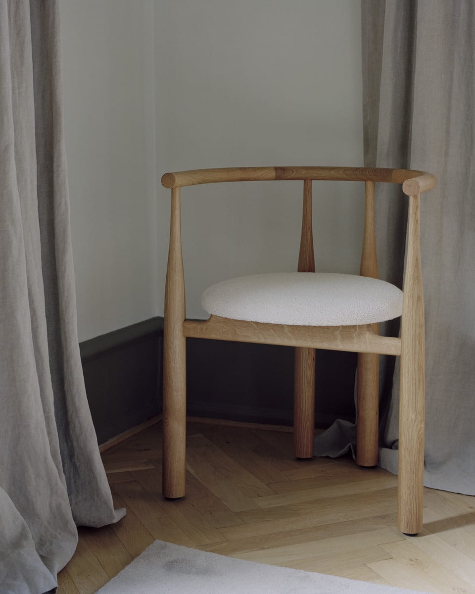 Powrót do mid-century modern? Nie do końca. Ekstremalne proporcje nadają elegancką i zaskakującą formę tej aktualizacji starego klasyka. Płynne, ale zdecydowane przejście między smukłymi i masywnymi nogami, które tworzą krzywe nogi krzesła, jest rozgrywane jak żywy taniec z materiałem. Równowaga ciężaru względem podłoża nadaje krzesłu mocny i monumentalny charakter. W centrum rzeźbiarskiej struktury znajduje się tapicerowane siedzisko, dające możliwość różnych form wyrazu poprzez kombinacje drewna i tkaniny. Dzięki śmiałej geometrii, krzesło Bukowski prezentuje uderzającą sylwetkę, natychmiast rozpoznawalną, nieokreślenie znajomą i całkowicie własną.