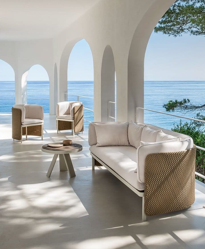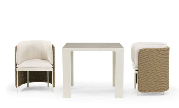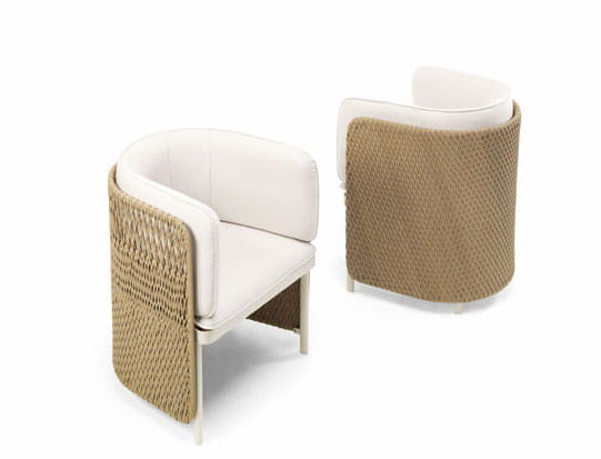 Kolekcja Esedra czerpie swoją nazwę z tego elementu klasycznej architektury, aby stworzyć kompletną gamę mebli o współczesnym wyglądzie, ustanawiając związek pomiędzy różnymi materiałami, takimi jak włókno syntetyczne użyte do produkcji oparć siedzisk, poddane obróbce technologicznej, która odtwarza wrażenie naturalnie utkanego włókna, materiałowe obicie poduszek i aluminiowe nogi.