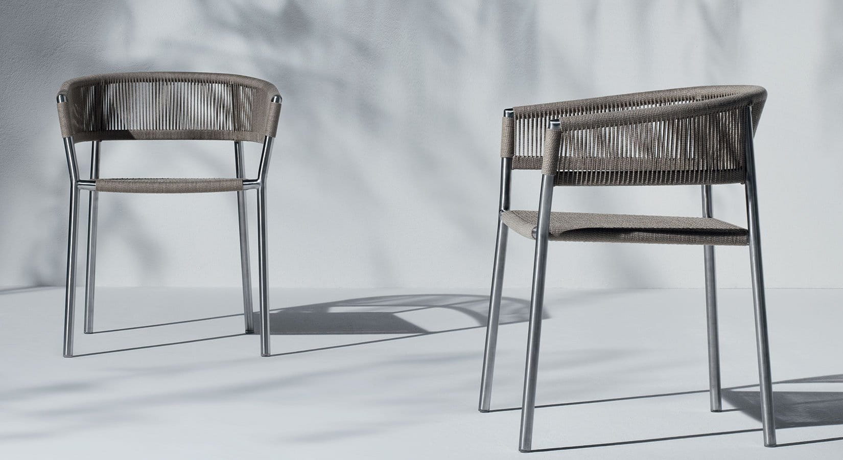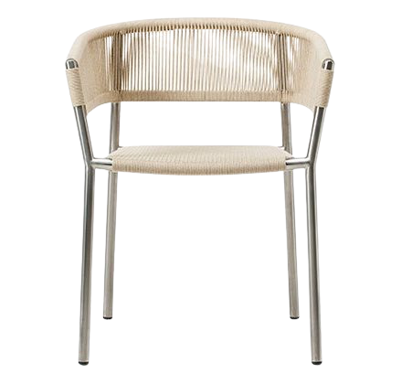 Fotel z ramą z stali i tapicerką z plecionej liny w kolorze szarym.