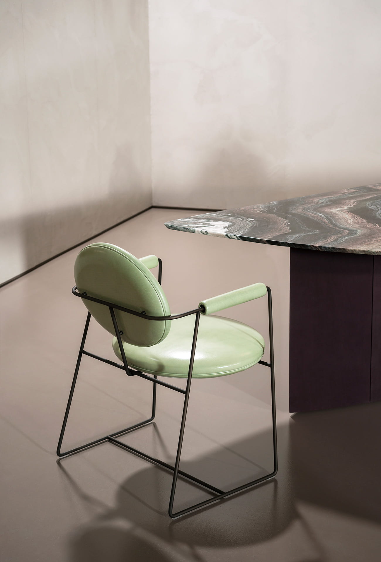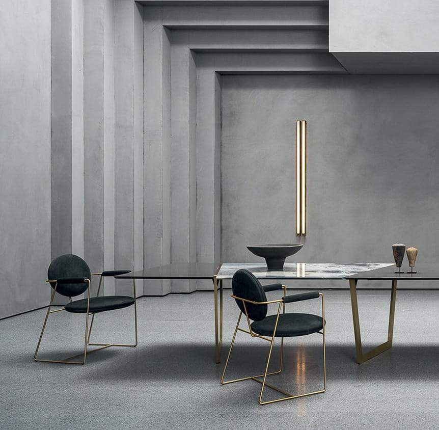 Gdy umieścimy je w jadalni, wokół stołu, może stworzyć relaksującą i nieformalną atmosferę dla gości; w biurze zaprasza do dzielenia się pomysłami; w salonie jest harmonijnym przerywnikiem między innymi siedzeniami. W jego żywych liniach, nadanych przez połączenia między oparciem i podłokietnikami oraz obiciem i konstrukcją z metalowych prętów, odnajdujemy grę brył i pustych przestrzeni, która nawiązuje do wnętrz włoskiego kina autorskiego, do tych willi egzystencjalizmu, gdzie bycie panem, wraz z uczuciami bohaterów, było smakiem, w który ubierali swoją własną rzeczywistość.