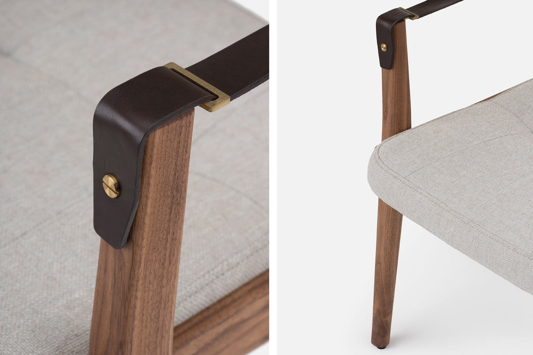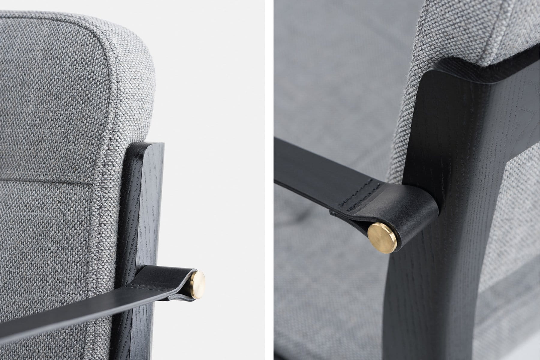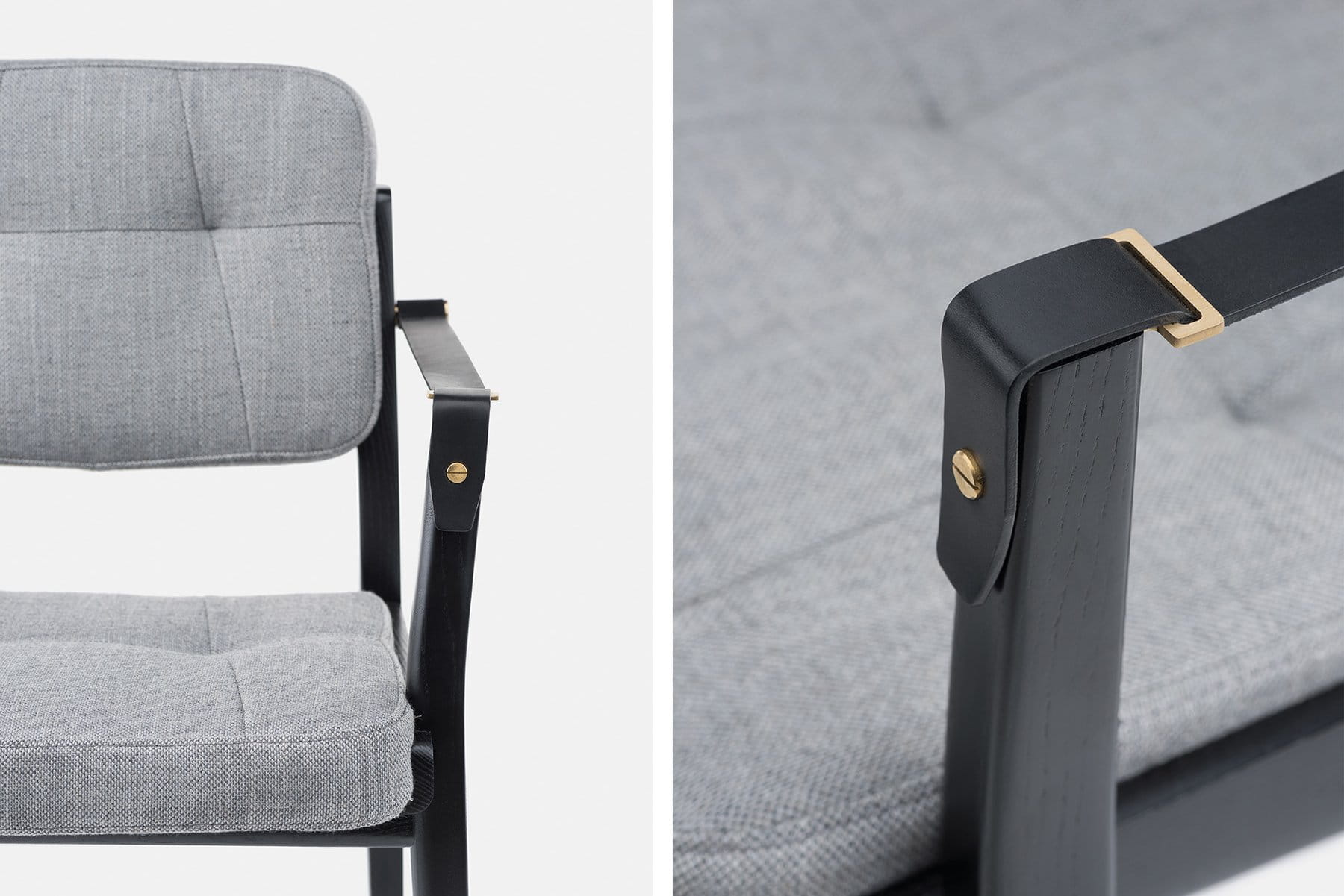 Dostępne w kolorze orzecha, dębu lub jesionu, w różnych wykończeniach oraz w różnych opcjach tkanin i skóry. Skórzane ramiona do paska w kolorze czarnym lub brązowym z detalami PVD w kolorze mosiądzu.