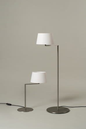 Seria Americana zbudowana jest na obrotowym ramieniu z niklu satynowego, trzymającego elegancki klosz z białego lnu. Ramię delikatnie obraca światło bliżej lub dalej, podczas gdy szeroka metalowa podstawa pozostaje na miejscu, przywołując harmonijny ruch tańca swingowego.