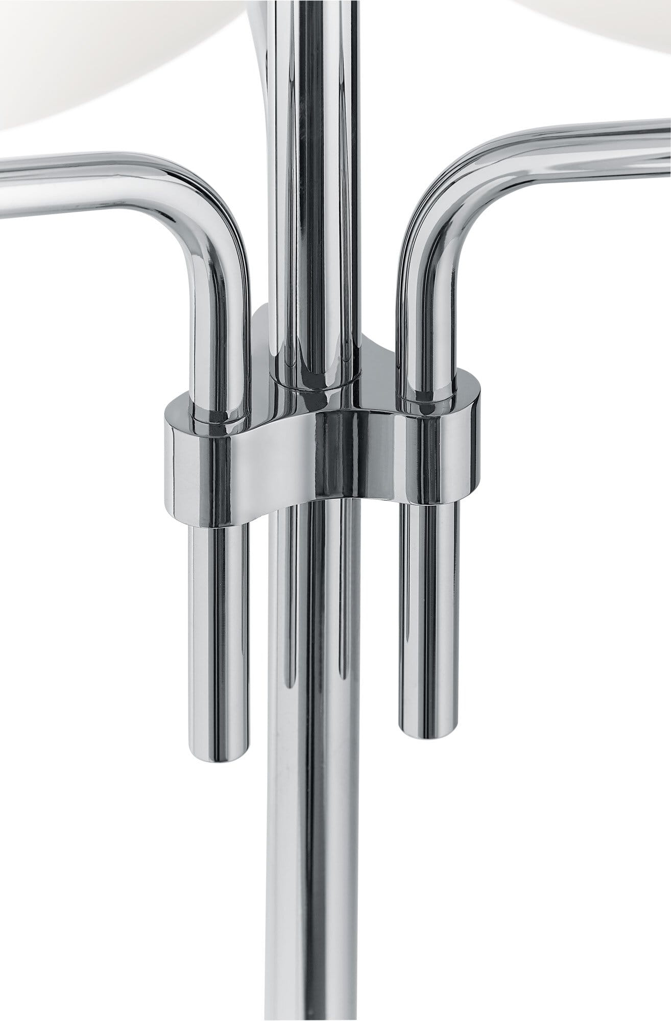 Jej korpus jest wykonany z rur, zakrzywionych i połączonych razem, tworzących mosiężny klejnot. Marmurowa podstawa tak typowa dla projektanta i gałka na górze, dla zrównoważenia kształtami i proporcjami. Wszystko otoczone trzema "ognikami" pokrytymi dmuchanym szkłem weneckim.
