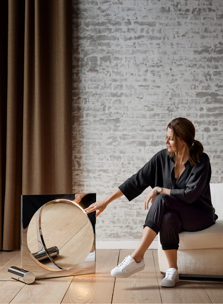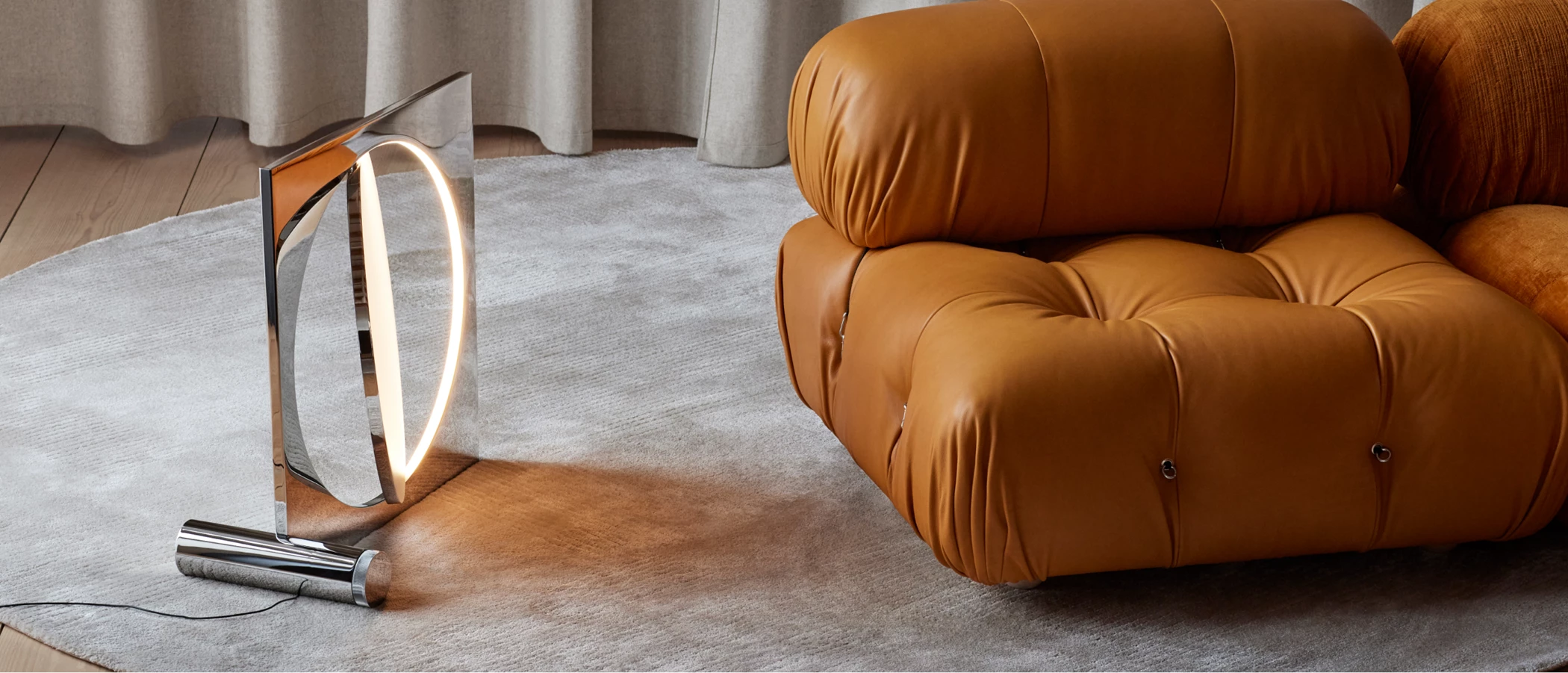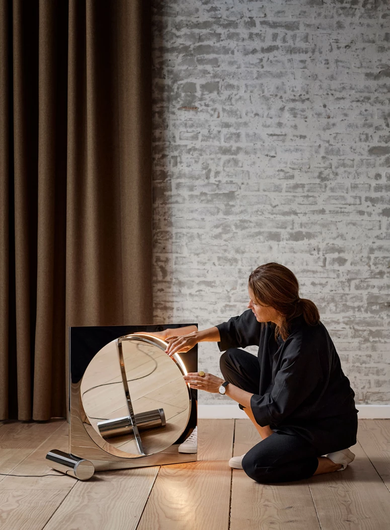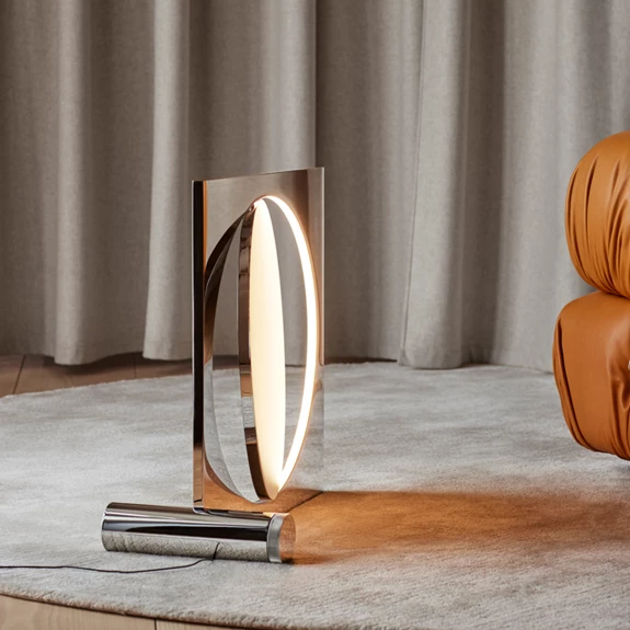 Rzeźbiarska lampa podłogowa z chromowanego aluminium jest wyposażona w obrotowy dysk, który umożliwia dostosowanie odbicia nieoślepiającego światła emitowanego przez źródło światła LED elegancko zanurzone w ramie. Tarcza obraca się o 360° wokół własnej osi i jest z jednej strony biała, a z drugiej odblaskowa. Przechylona w stronę białej strony światło staje się miękkie i rozproszone, podczas gdy przeciwległa chromowana strona odbija bezpośrednio panel świetlny, nadając mu zupełnie inny wyraz. Światło jest kierowane w zależności od położenia tarczy. Otoczenie odbija się w ramie i na chromowanej stronie tarczy. Lampa umożliwia bezstopniowe ściemnianie i jest włączana i wyłączana za pomocą obrotowego przełącznika nożnego na cylindrze.