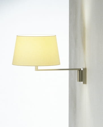 Obrotowe ramie z niklu satynowego, klosz z białego lnu.