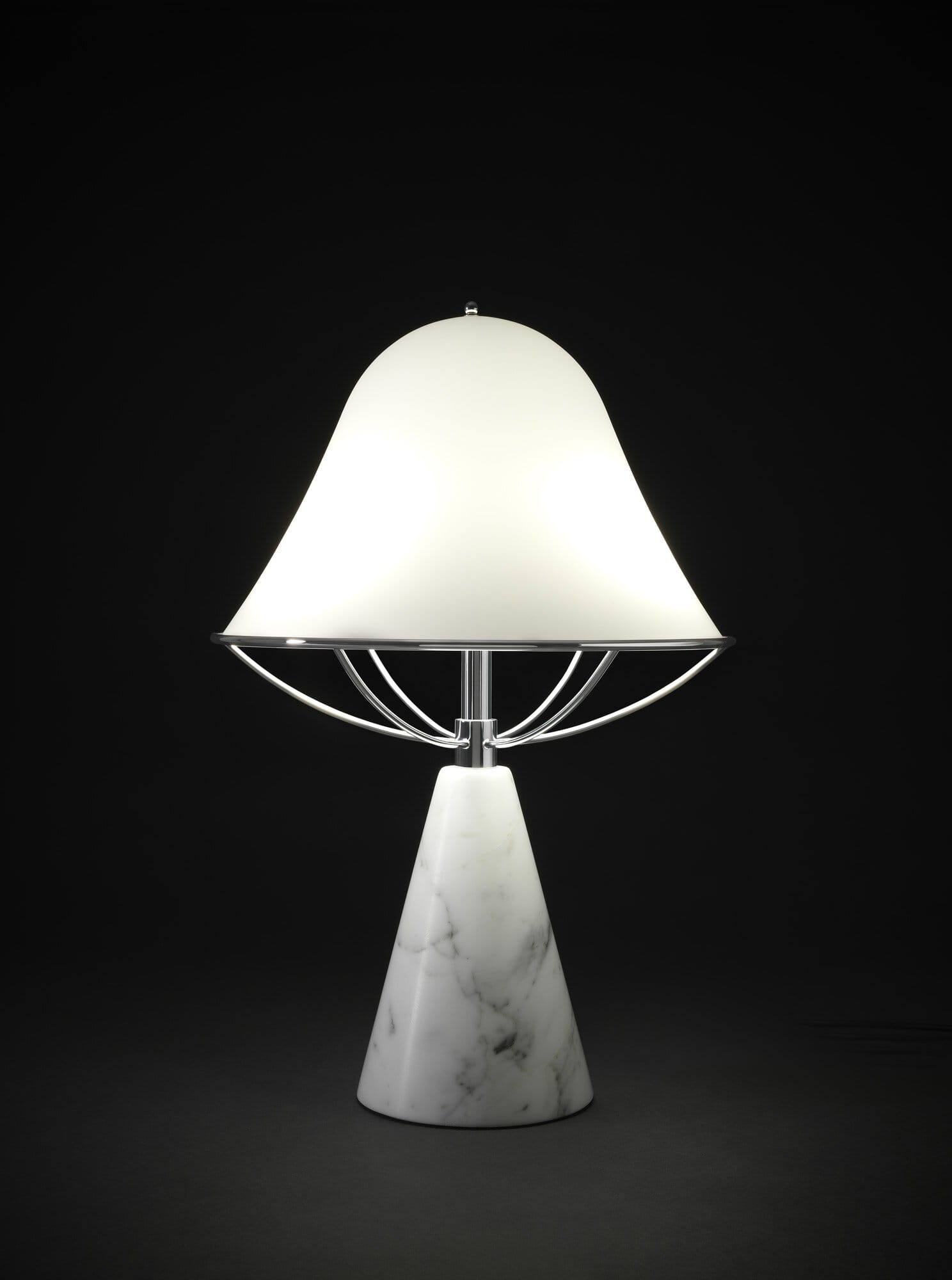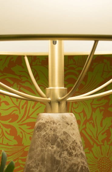 Marmurowa podstawa w kształcie stożka podtrzymuje mosiężną konstrukcję spawaną przez wykwalifikowanych rzemieślników, dzięki czemu jest to wspaniały przedmiot. Klosz z dmuchanego weneckiego szkła zakrywa oprawy oświetleniowe, tworząc atmosferę z dawnych czasów.