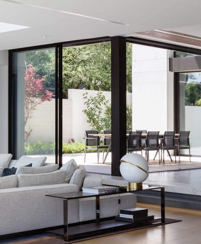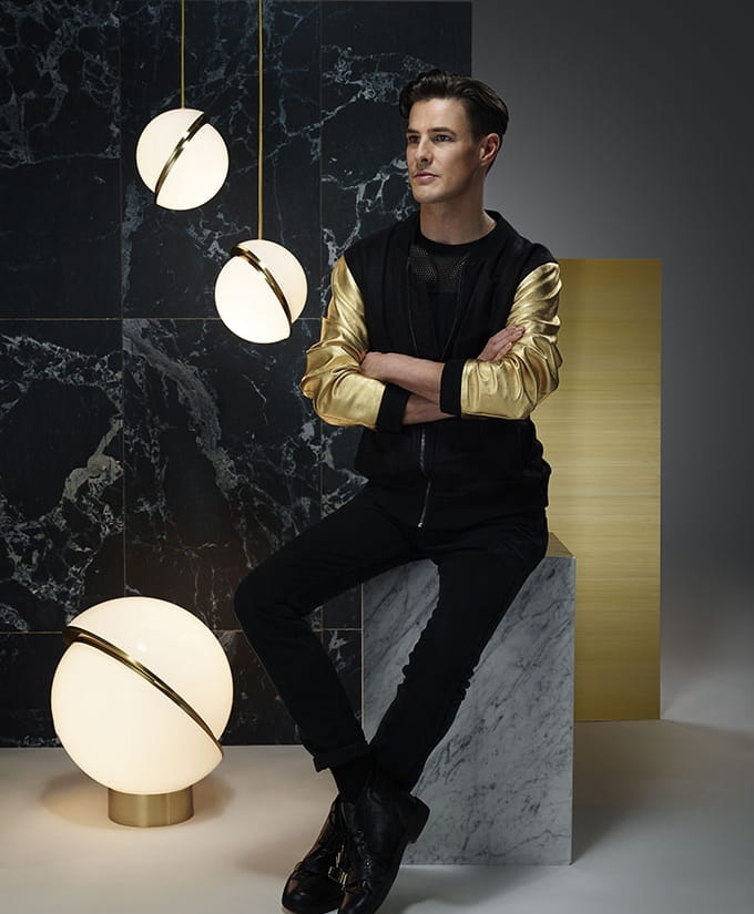 Oświetlona kula jest przecięta asymetrycznie na pół, aby odsłonić kształt półksiężyca ze szczotkowanego mosiądzu. Crescent płynnie łączy w sobie bryłę i nieprzejrzystość.