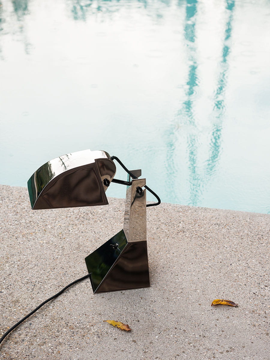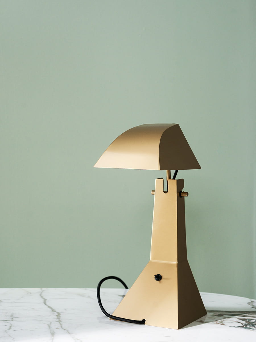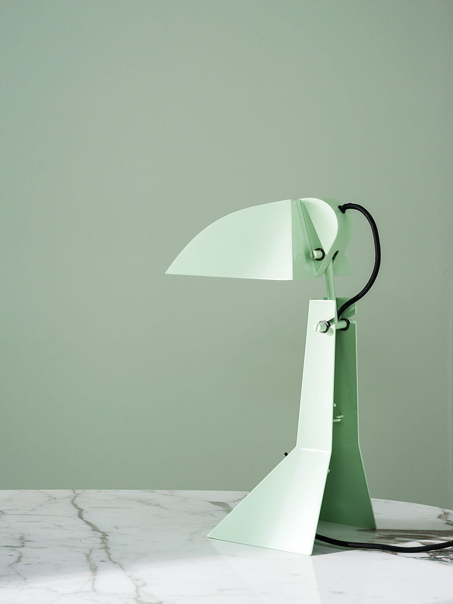 Projekt tej lampy pochodzi z 1963 roku, a dziś jest ponownie wydany pod nazwą E63. Ten alfanumeryczny kod jest odzwierciedleniem intelektualnej złożoności jej projektanta, Umberto Rivy: po części architekta, po części projektanta, po części artysty, po części badacza światła. Lampa stołowa zaprojektowana z wielką precyzją, charakteryzująca się prostymi liniami wokół szerokich powierzchni, które pozornie nadają solidną formę samemu światłu: stal, niemalże zbroja, chroniąca cenne źródło.