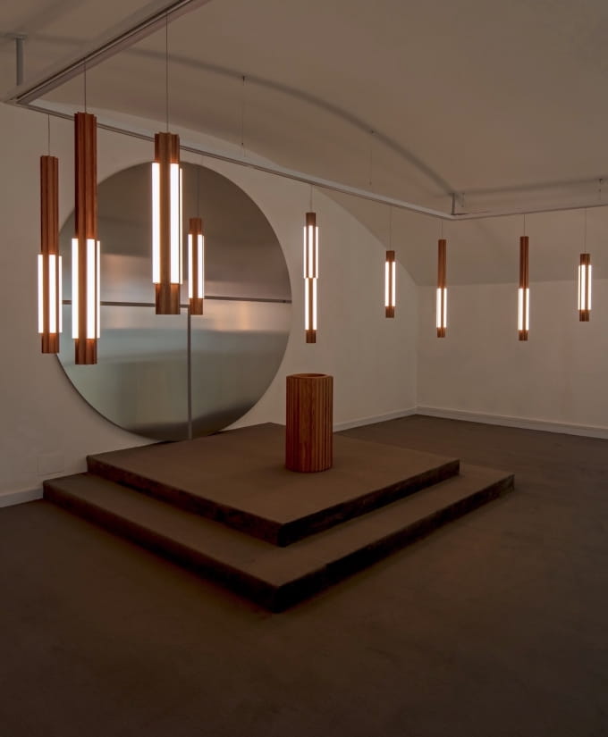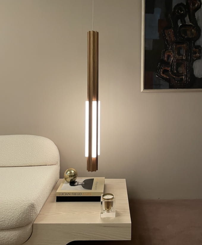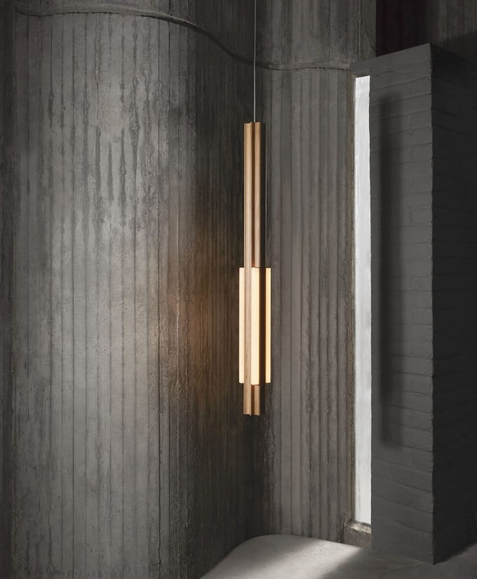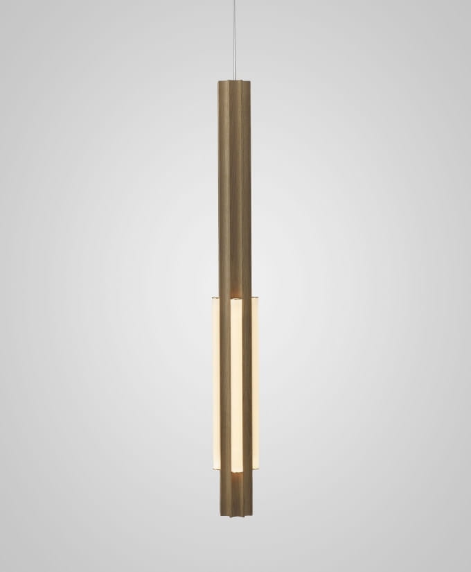 Altar to eksploracja kanciastych form kościołów i ołtarzy z połowy ubiegłego wieku, które często wykorzystywały cieplejsze, naturalne materiały na chrzcielnice i ławki. Elegancka, żłobkowana forma Altar została wyrzeźbiona z litego dębu i uzupełniona o podświetlaną tubę, płynnie osadzoną w architektonicznych rowkach. Lampa dostępna w dwóch rozmiarach, może być zawieszona na kablu lub zamontowana na powierzchni sufitu.