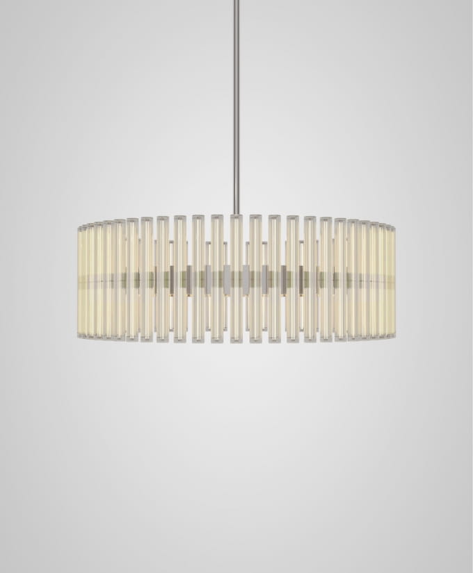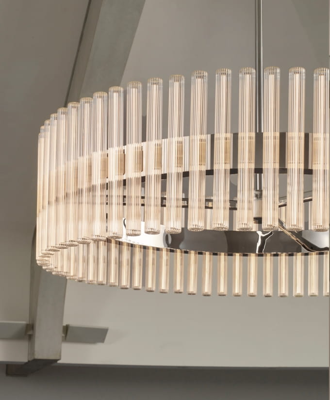 Żyrandol o wielu adaptacjach, który rzuca warstwy eterycznych pierścieni światła utworzonych z liniowych żarówek LED. Stworzone i wyprodukowane przez Lee Broom, ręcznie dmuchane szklane żarówki zawierają prostopadły żarnik LED, który załamuje się na pionowych liniach. Odbijając się w pierścieniach światło tworzy efekt świecącej aury.
