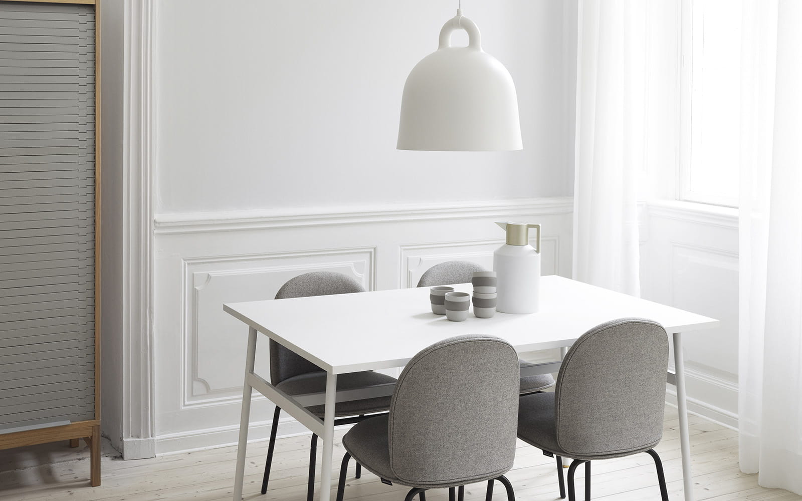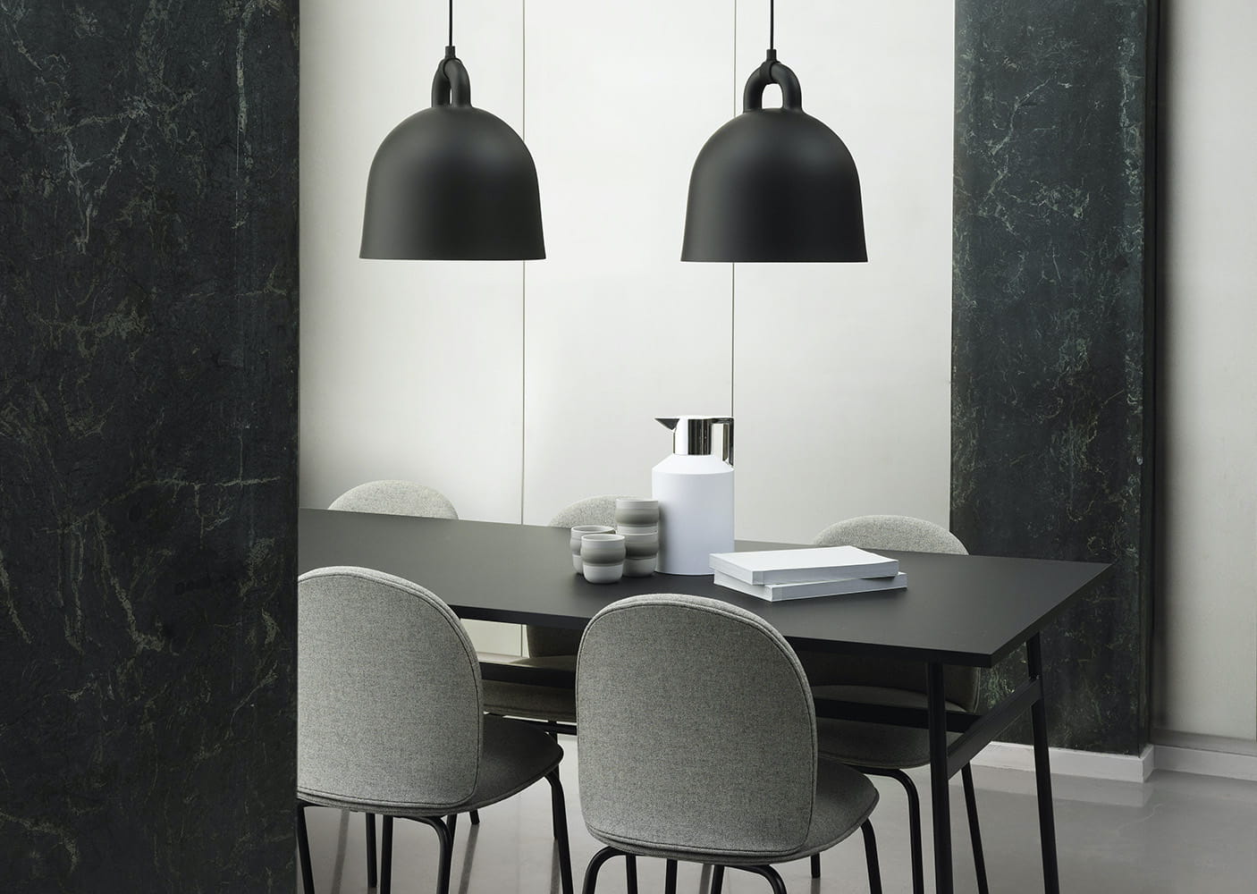 Punktem wyjścia dla projektantów Andreasa Lunda i Jacoba Rudbecka jest ikoniczny kształt dzwonu. Zaokrąglona sylwetka lampy i jej matowa powierzchnia sprawiają wrażenie, jakby została odlana. Biała wewnętrzna strona odbija światło, które pada jak stożek i zapewnia praktyczne oświetlenie o wielu zastosowaniach. Projektanci zwrócili szczególną uwagę na szczegóły, podkreślając w nowoczesny sposób punkt styku między przewodem a samą lampą. Wyczuwalne w dotyku różnice między materiałami tworzą czysty, minimalistyczny wygląd. Gładkie aluminium na tle miękkiej gumy tworzy dyskretną, ale efektowną grę materiałów, dając życie projektowi.