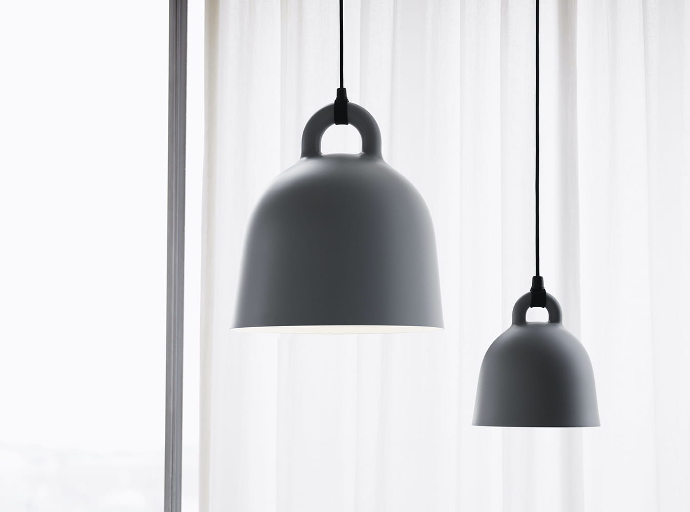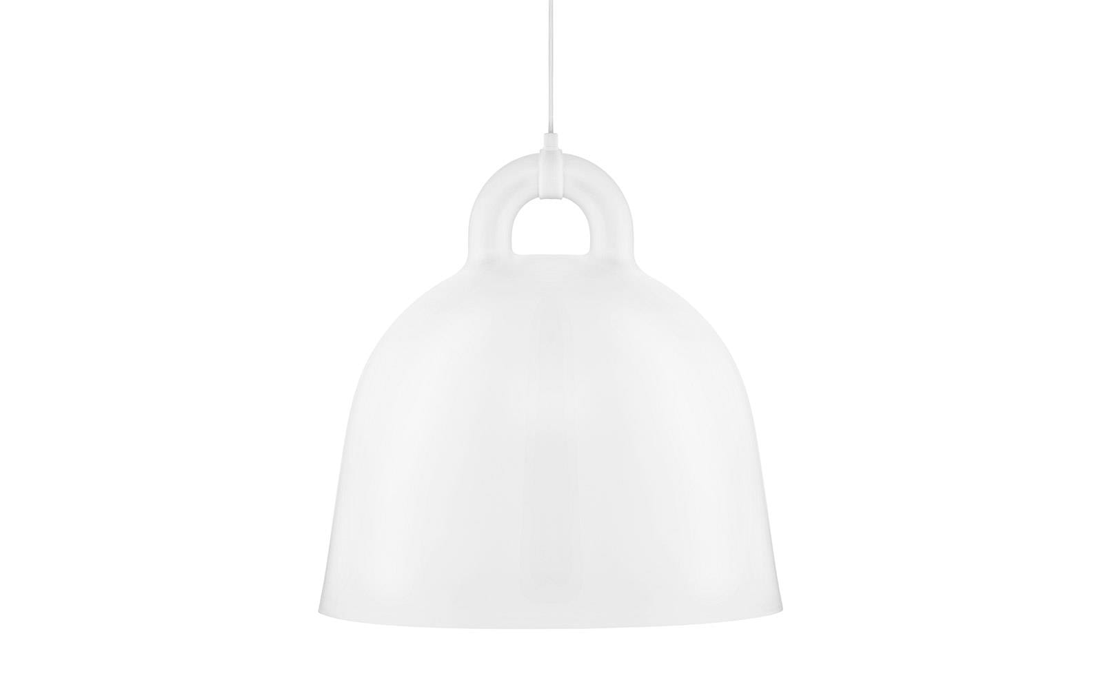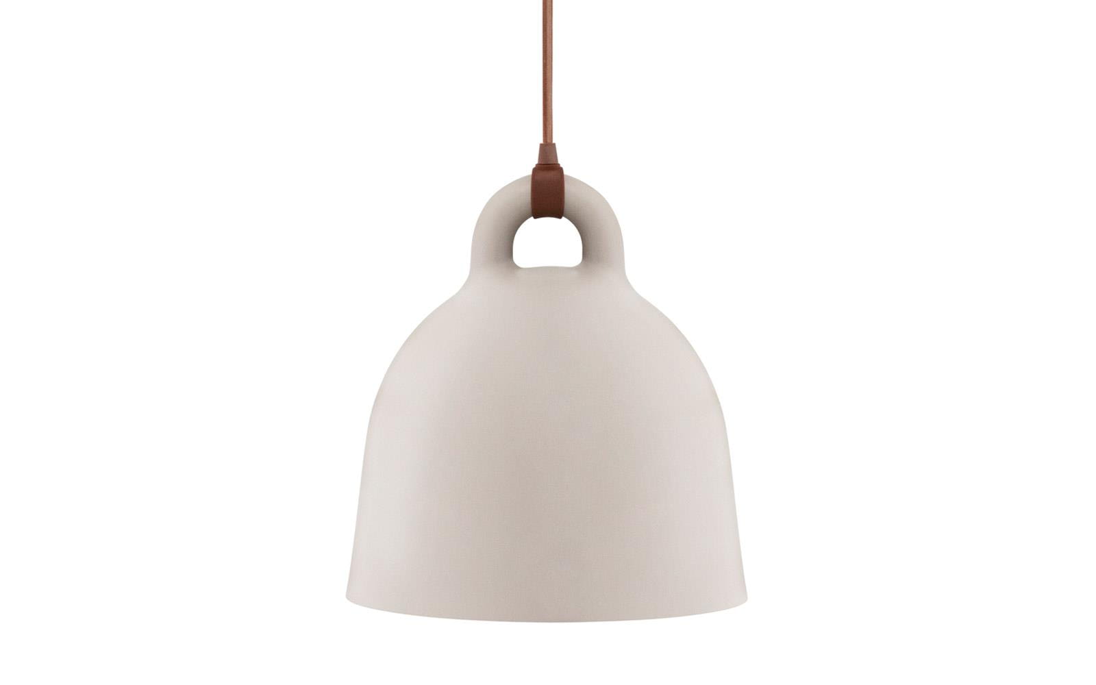 Bell Lamp w wersji białej i czarnej mają pasujące kolorem kable i podsufitki. Lampa Bell Sand ma brązowy kabel i białą podsufitkę. Lampa Bell w kolorze szarym ma czarny kabel i podsufitkę.