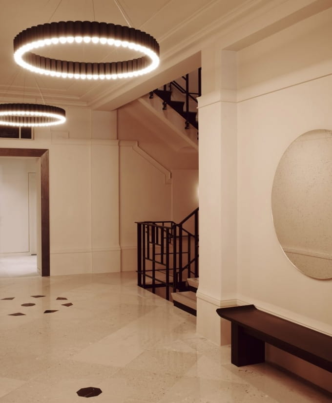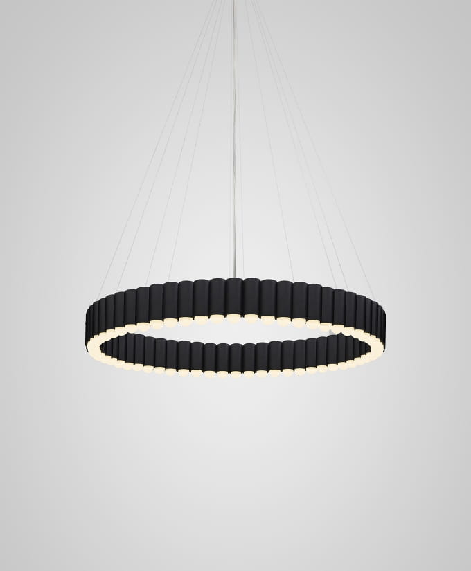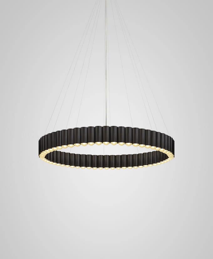 Zainspirowana karuzelą z tradycyjnego brytyjskiego wesołego miasteczka, Carousel to lampa wisząca o dużej masie, która delikatnie unosi się w przestrzeni. W każdym z cylindrów w kolorze złotym, chromowanym, brązowym lub czarnym umieszczono element oświetleniowy LED, tworząc w ten sposób spektakularny, a zarazem zabawny pierścień światła. Lampa Carousel jest zawieszona na okrągłej płycie sufitowej o dopasowanym wykończeniu za pomocą stalowych linek z pojedynczym przezroczystym przewodem.