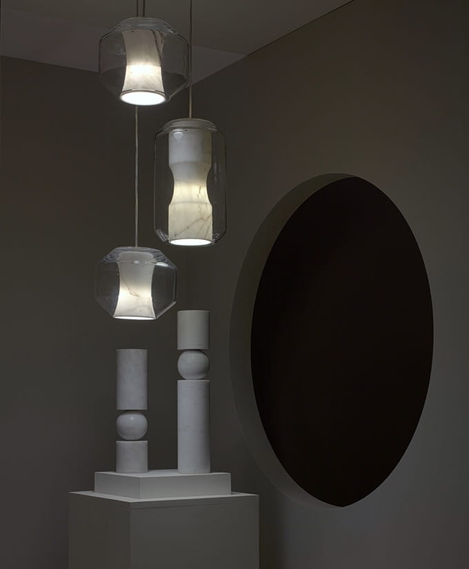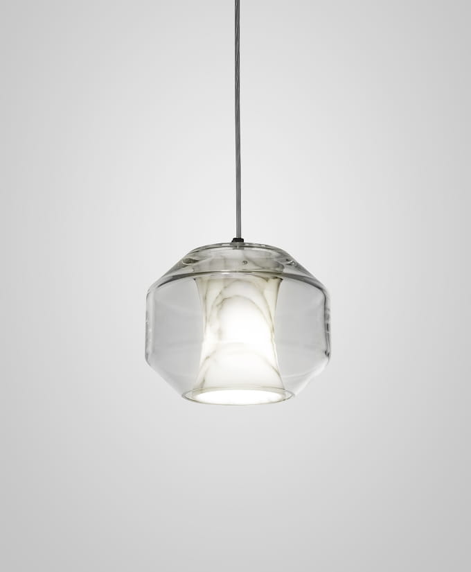 Umieszczając rzeźbiarski dyfuzor z marmuru karraryjskiego w naczyniu z kryształu ołowiowego, Chamber wyraża nieoczekiwane półprzezroczyste właściwości marmuru w atrakcyjnej dekoracyjnej lampie wiszącej. Dzięki delikatnej jasności i kierunkowemu oświetleniu w dół, Chamber jest dostępny w dwóch rozmiarach i nadaje się do zawieszenia w klastrach, jak również pojedynczo.