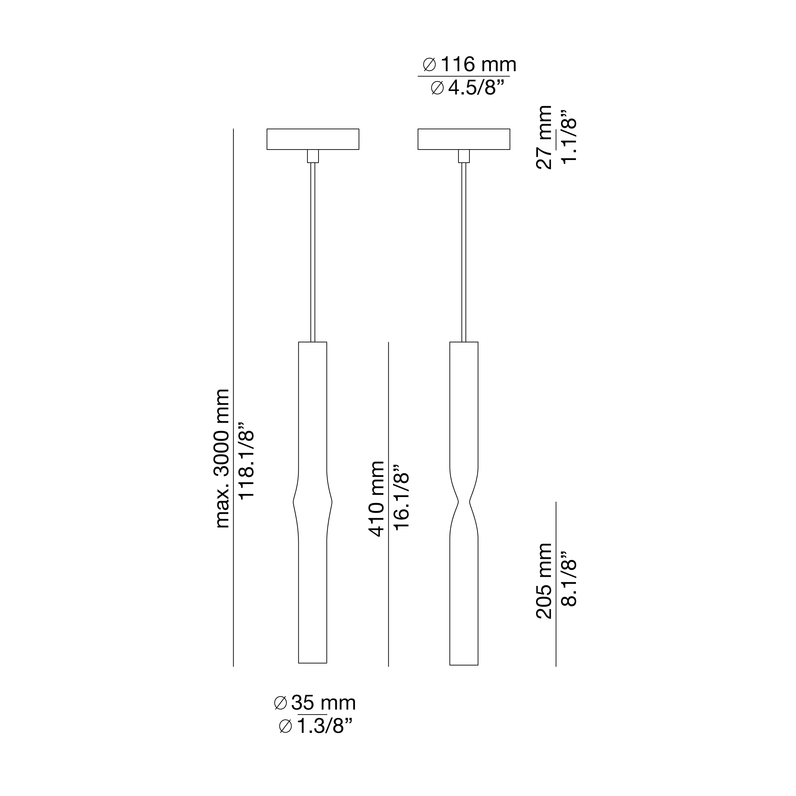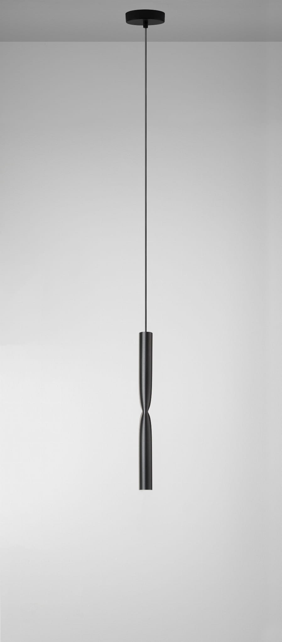 Klosz wykonany z metalowej rurki rozbitej w środku i akrylowej soczewki z wbudowaną diodą LED. Regulowana wysokość i indywidualna podsufitka, nadaje się do tworzenia kompozycji.