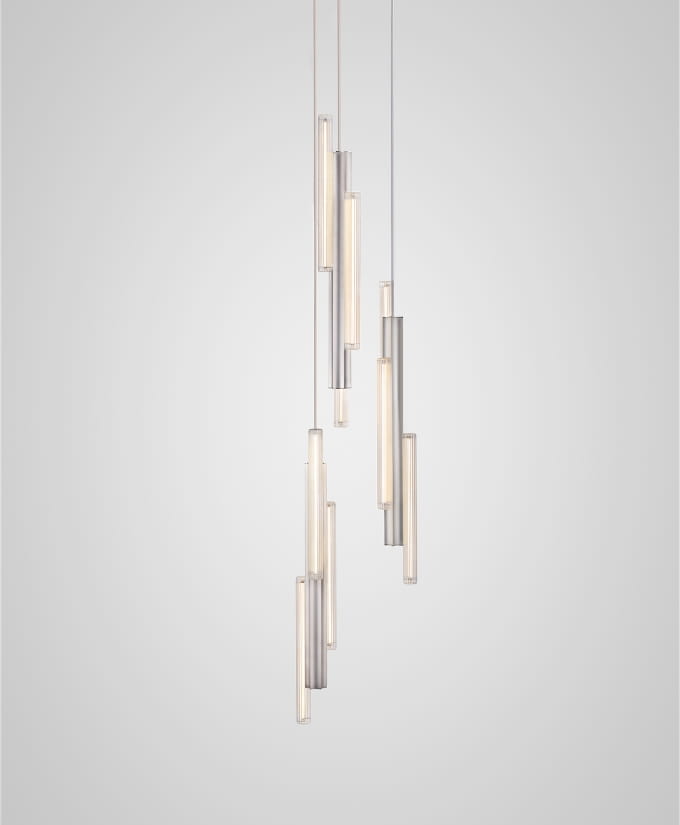 Hail jest zainspirowany odłamkami światła i cienia, które często pojawiają się w oknach lancetowych w rozległych łukach kościelnych. Dostępna w trzech standardowych rozmiarach w złotym lub srebrnym, szczotkowanym wykończeniu, lampa Hail ma wydłużoną, żłobkowaną formę wykonaną z aluminium z asymetrycznie rozmieszczonymi wzdłuż jej struktury żarówkami ze szkła trzcinowego. Lampy można również łączyć, tworząc unikalne konfiguracje dostosowane do potrzeb klienta.