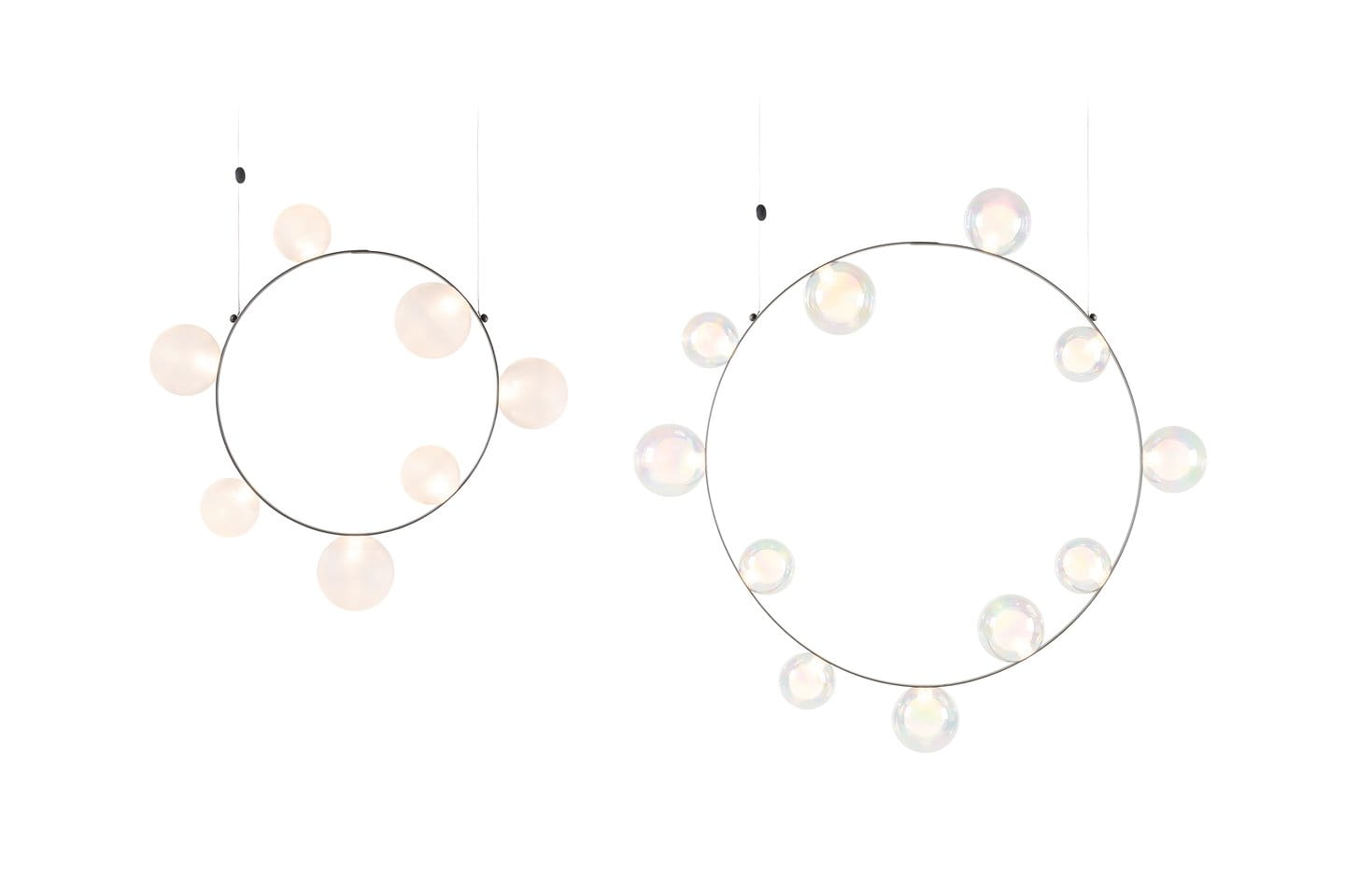 Hubble Bubble, zaprojektowana przez studio Marcela Wandersa, to zwiewna i radosna lampa wisząca. Dostępna jest w dwóch rozmiarach, z 7 lub 11 szklanymi bańkami LED w wersji olejowo-przejrzystej lub matowej. Hubble Bubble może być zawieszona zarówno poziomo jak i pionowo i jest zasilana przez Electrosandwich® by Marcel Wanders. Hubble Bubble to wesoły element dekoracyjny w Twoim domu, który można powiesić pod dowolnym kątem.