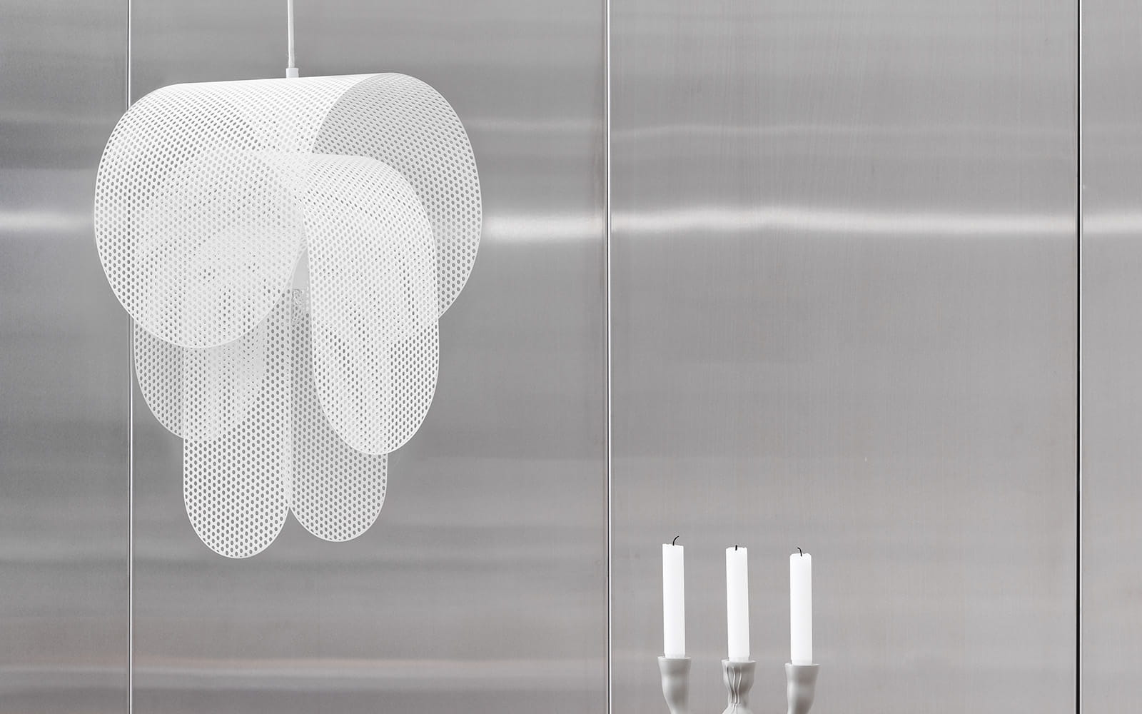 Superpose to nazwa nowej rzeźbiarskiej lampy autorstwa projektanta Frederika Kurzwega dla Normann Copenhagen. Lampa składa się z trzech wygiętych i zaokrąglonych, perforowanych stalowych arkuszy, które są koncentrycznie ułożone wokół siebie, przesunięte dokładnie o 180 stopni. Dzięki nałożeniu geometrycznych kształtów powstaje imponujący, rzeźbiarski wygląd, który zmienia się w zależności od pozycji widza. Efekt ten podkreślają perforowane wzory, które sprawiają, że powierzchnie wydają się mniej lub bardziej półprzezroczyste. Dokładnie wyważone proporcje wygiętych warstw zmniejszają się w kierunku środka lampy, a nakładające się na siebie arkusze budują zmieniające się wzory dzięki intrygującej zasadzie mory.