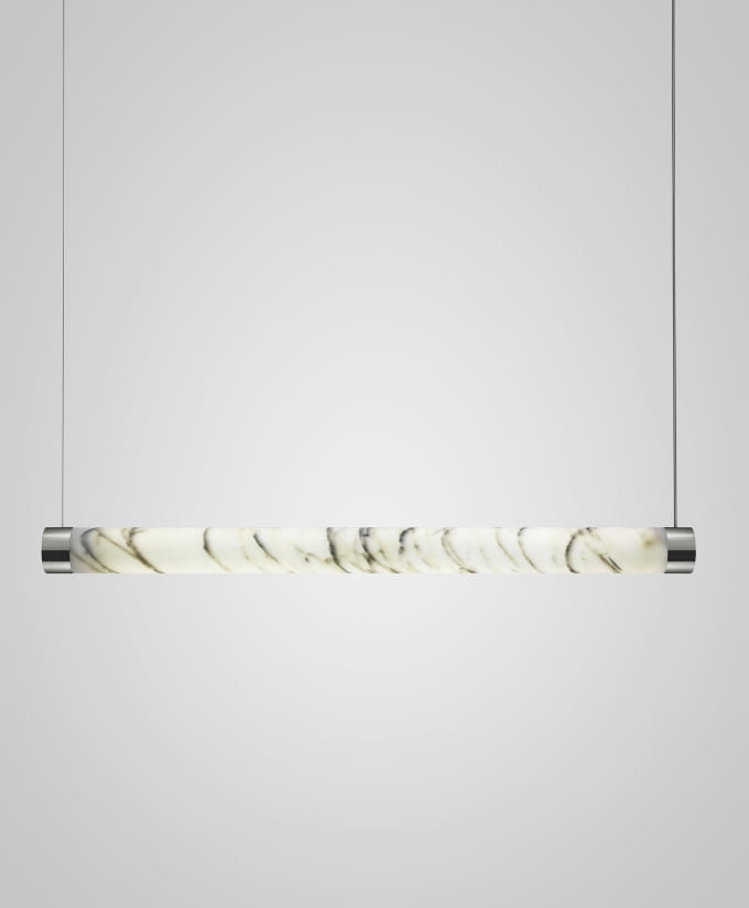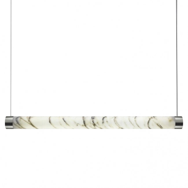Umiejętnie wyfrezowana z jednego kawałka marmuru Carrara i wykończona na każdym końcu mosiężną lub chromowaną obwódką, lampa Tube zawiera pasek żarówek LED, dzięki czemu sprawia wrażenie, że jest to jednolite pasmo ciepłego, świecącego kamienia. Unikalne żyły w każdym kawałku marmuru sprawiają, że żadne dwie lampy nie są dokładnie takie same. Ręcznie wykonana odmiana tradycyjnej świetlówki rurowej.