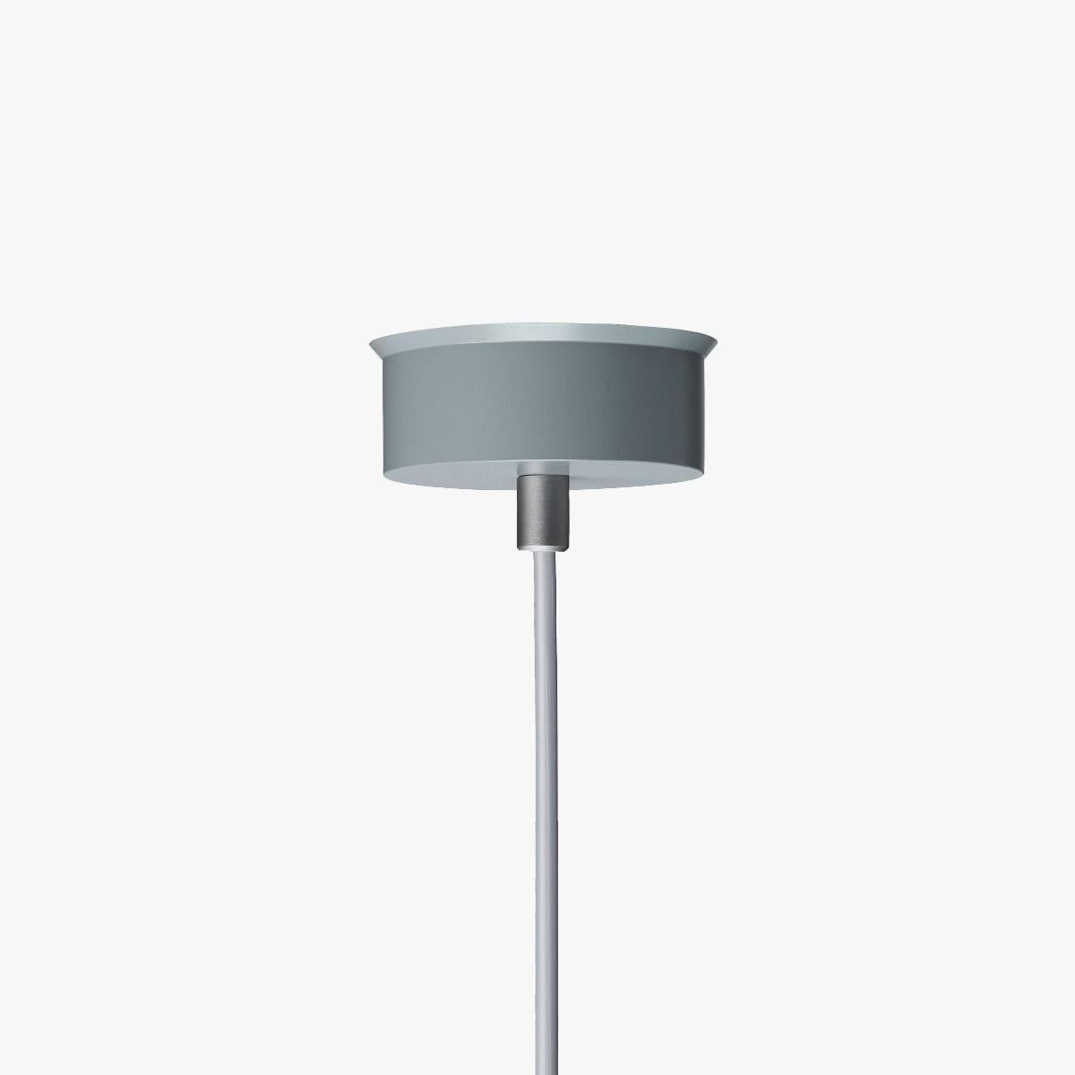Aluminiowy klosz, stalowe łączenie klosza z kablem, podsufitka z aluminium i stali. Matowa farba i anodowane aluminium.