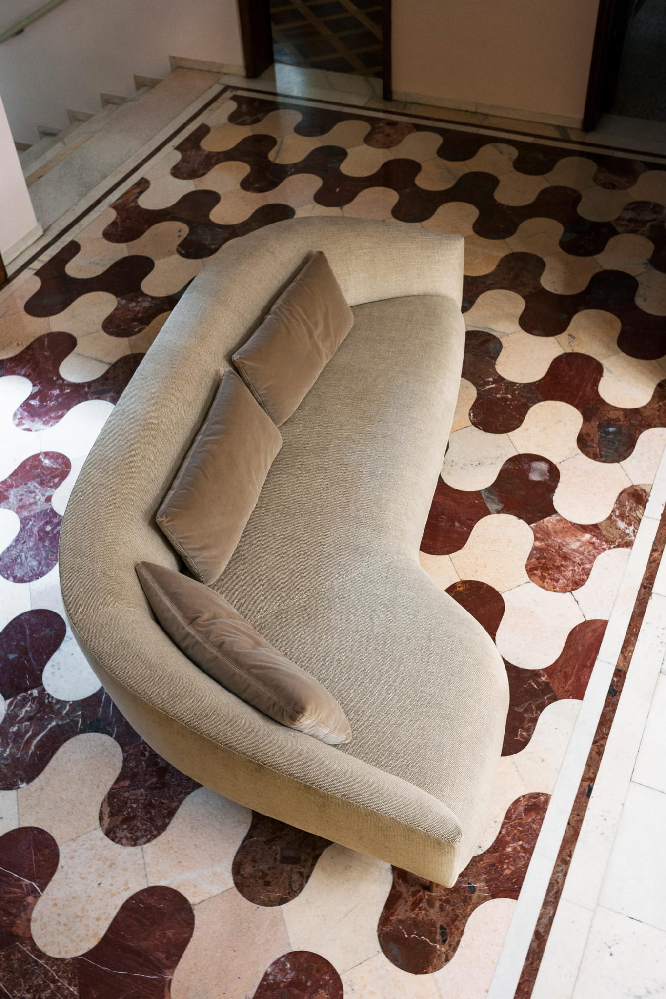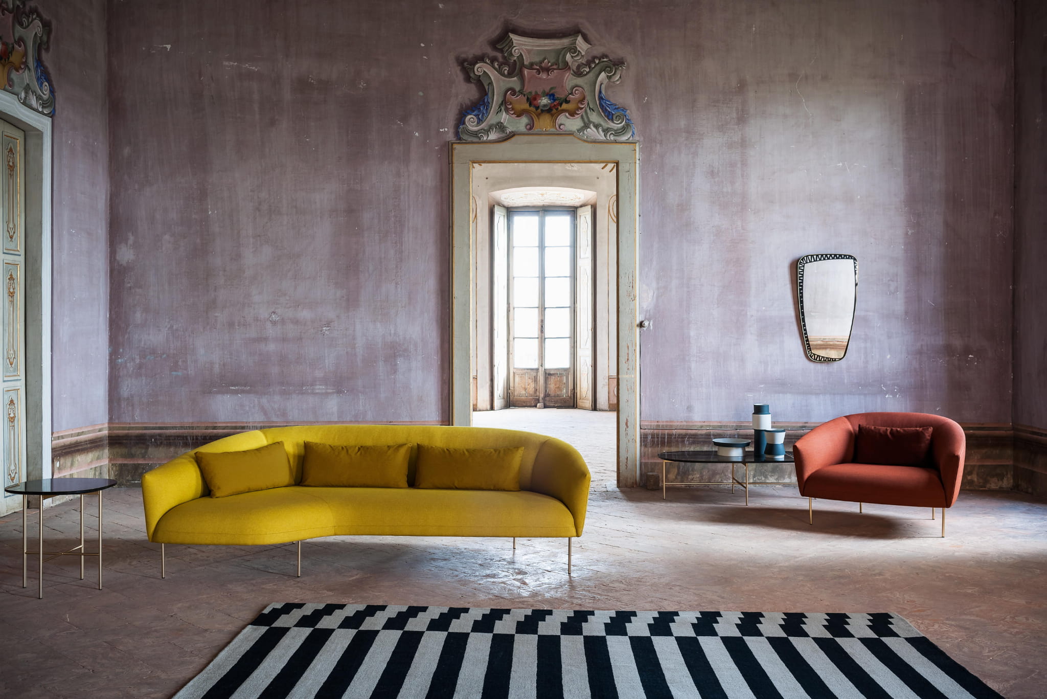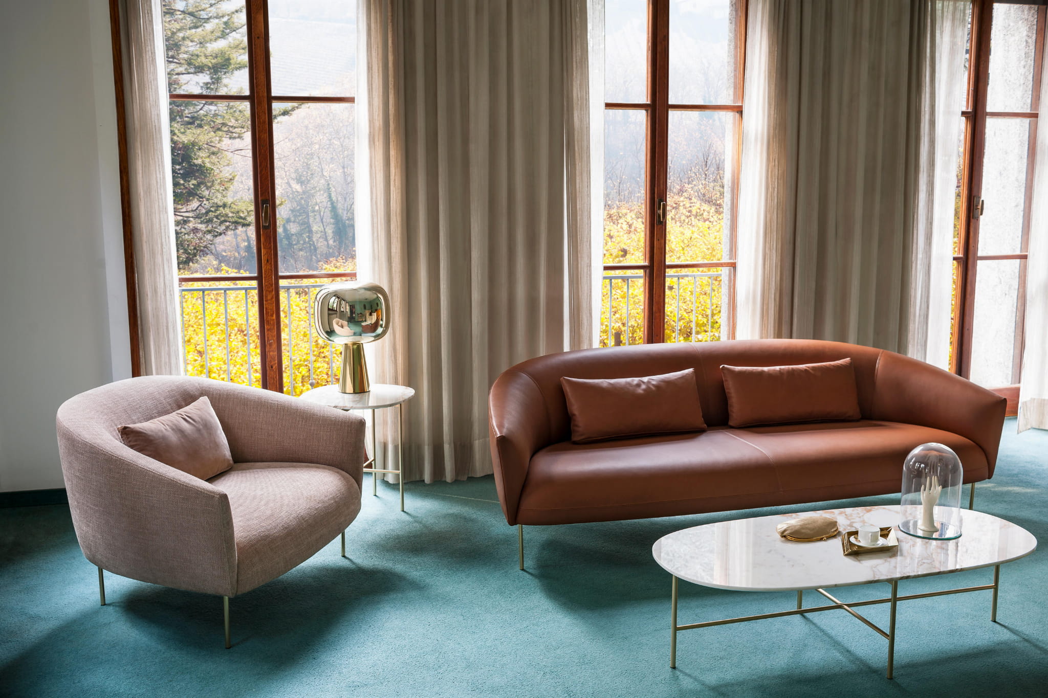 Prawie zawieszona nad podłogą, z najsmuklejszymi nogami podtrzymującymi duże, przytulne siedzisko. Jonas Wagell wyobraża sobie rodzinę sof, zainspirowaną miękką, zakrzywioną formą półkola: ta mała kolekcja, od fotela przez sofę po szezlong, nosi nazwę Roma, co jest silnym nawiązaniem do klasycznej sfery, w której zakorzenione są jej linie. Dzięki cytatom z wzornictwa lat pięćdziesiątych projekt ten jest "klasyczny" z natury, nie tylko z nazwy.