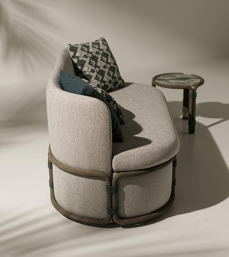 Rotin to kolekcja wypoczynkowa, w której kształt, kolor i treść łączą się, aby opowiedzieć historię nowego sposobu myślenia i korzystania z miejsc do relaksu w towarzystwie na świeżym powietrzu. Składająca się z sofy, fotela wypoczynkowego, stolika kawowego i pufy ze strukturą z trawionego drewna tekowego, kolekcja Rotin inspirowana jest tradycją azjatycką, w której bambus jest głównym elementem wyposażenia zewnętrznego, a także technikami zwykle stosowanymi w produkcji mebli rattanowych.