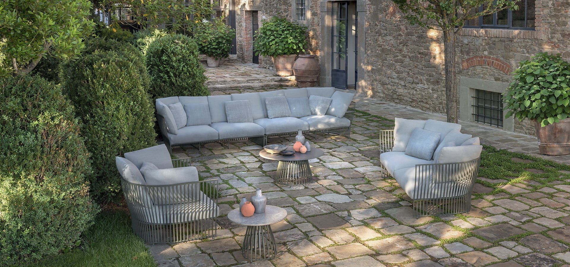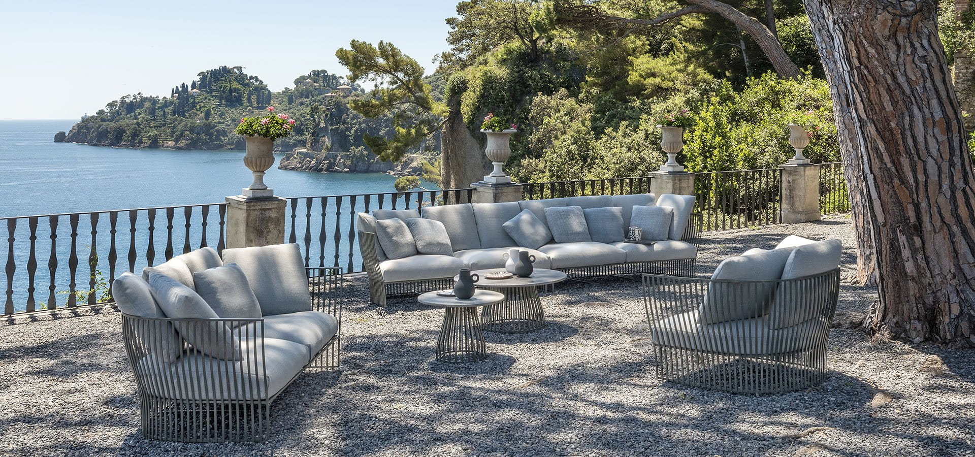 Elegancja mebli miejskich z końca XIX wieku odżywa w projekcie, który łączy w sobie ponadczasowy urok i nowoczesną funkcjonalność. Aluminiowa konstrukcja, która wizualnie przywołuje na myśl antyczne balustrady, charakteryzuje sofy i fotel, otulając obfite i zaokrąglone formy siedzisk, dając poczucie lekkości i solidności zarazem. Wypełnienie dużych, miękkich poduszek wykonane jest z materiałów pochodzących z recyklingu i jest całkowicie wodoodporne, a tapicerowane są one wyjątkowo miękką, w 100% outdoorową tkaniną. Dzięki swojej specjalnej fakturze pomagają one stworzyć jeszcze bardziej zaskakujący wygląd.
