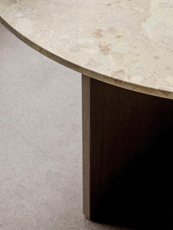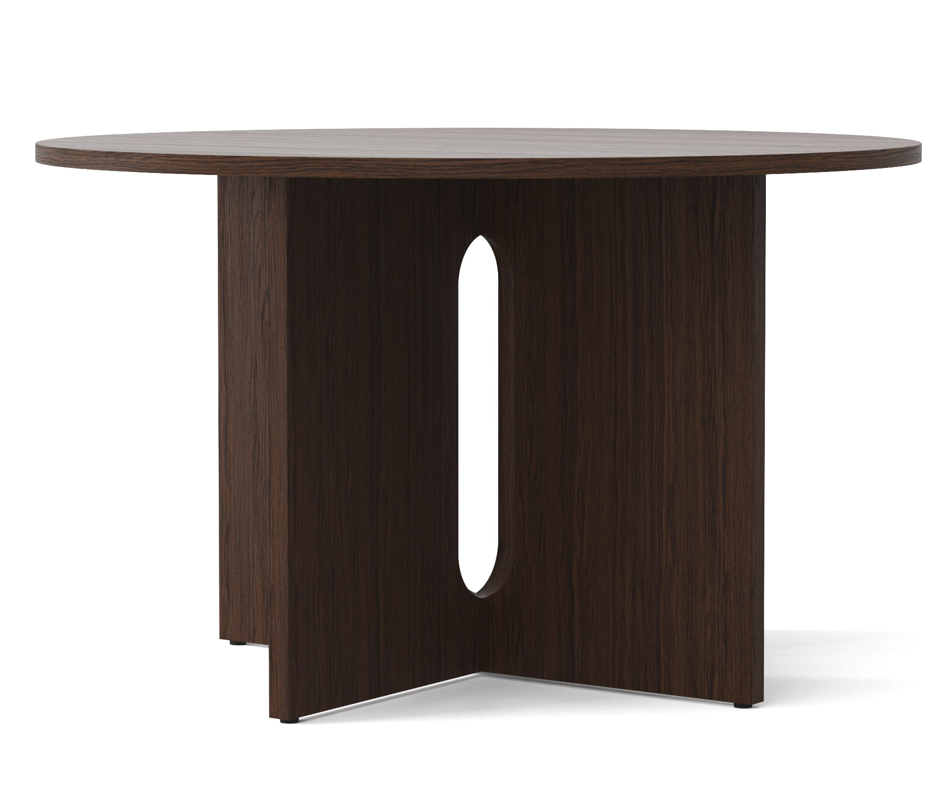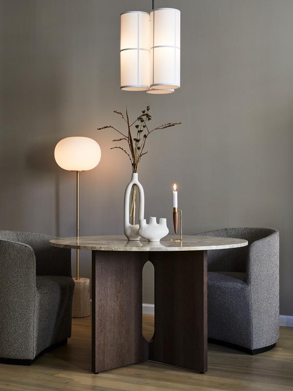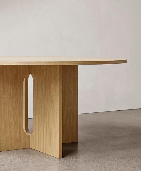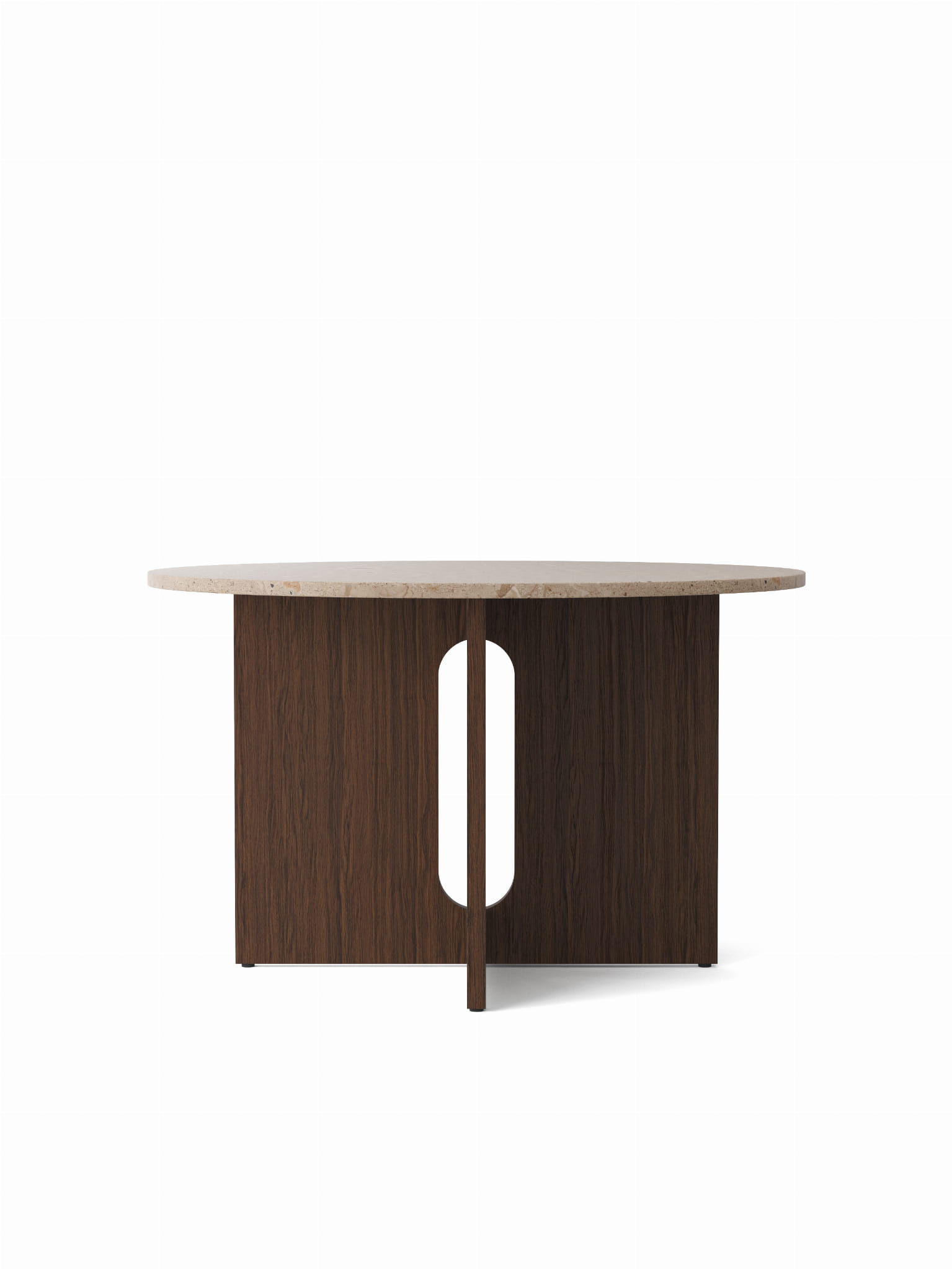 Stół do jadalni Androgyne łączy w sobie naturalne materiały. Dodaje on charakterystyczny akcent do każdej przestrzeni - od domowej jadalni po restaurację lub inne miejsce spotkań. Dostępny w dwóch rozmiarach z olejowanego lub bejcowanego na ciemno dębu lub Ø120 z drewnianą podstawą i marmurowym/kamiennym blatem, umożliwiając tworzenie niestandardowych kombinacji w kontrastujących teksturach i wykończeniach.