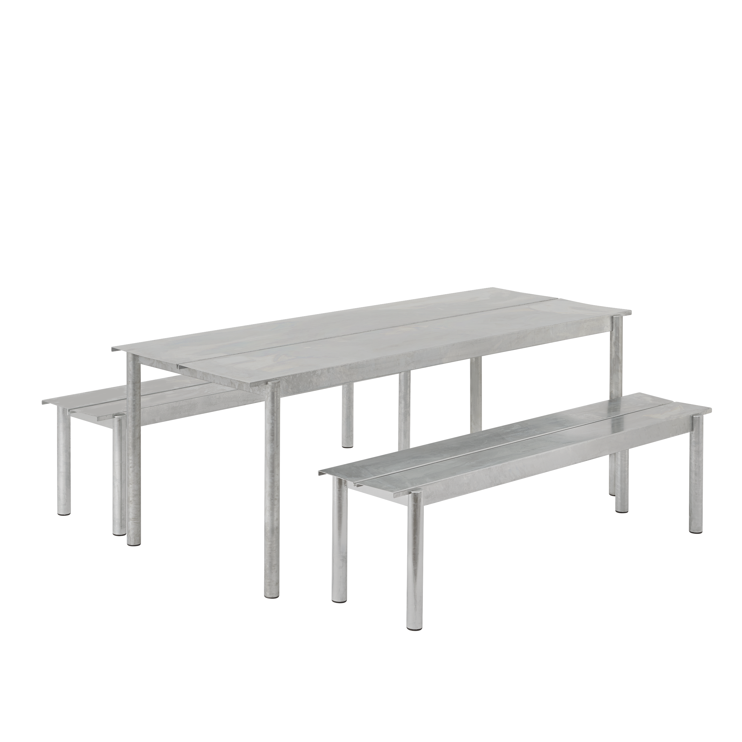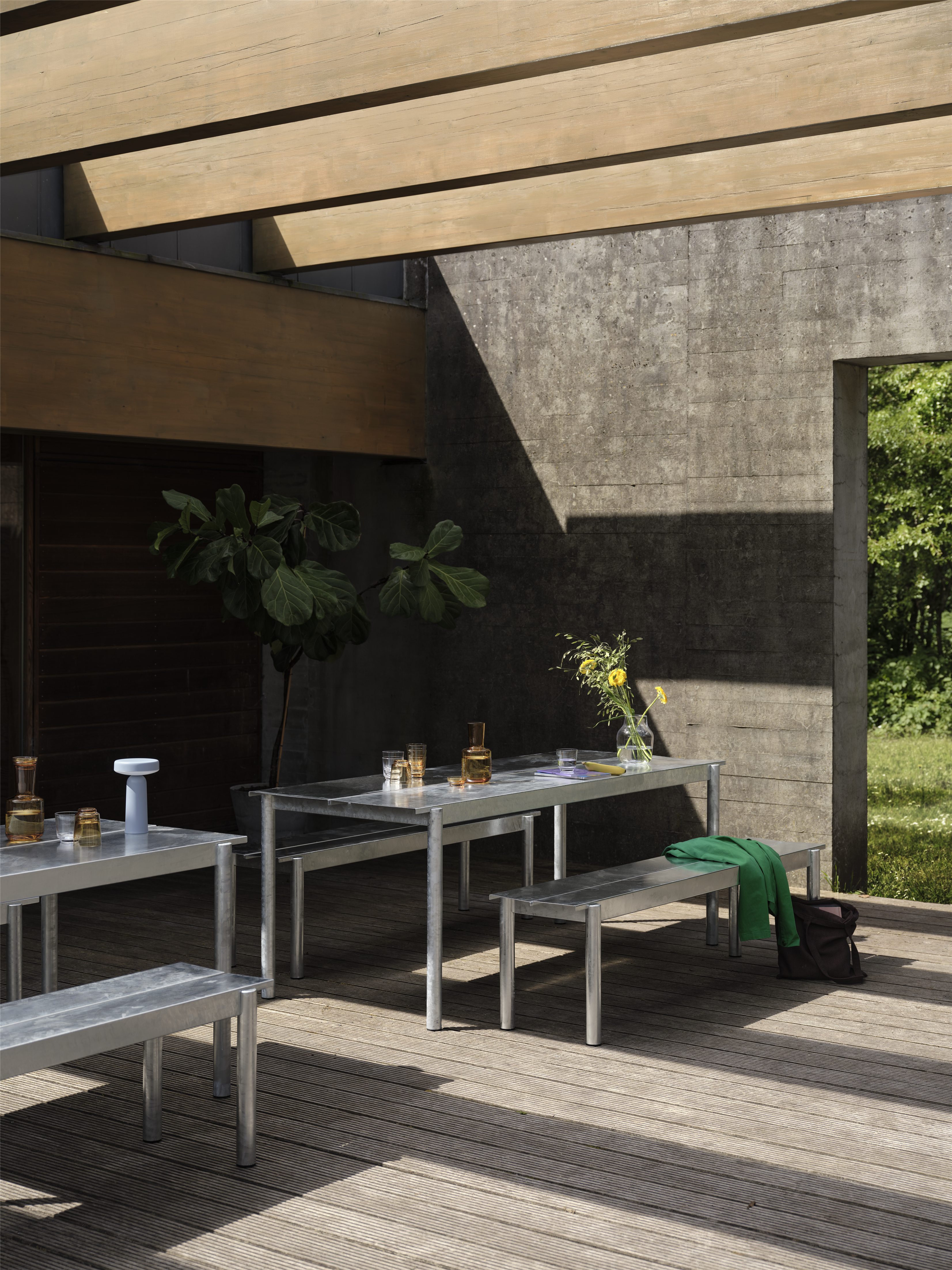 Linear Steel Table wnosi nową perspektywę do nowoczesnych mebli ogrodowych dzięki prostym liniom wzdłuż zagiętych krawędzi, półokrągłym przecinającym się nogom i niewielkim odstępom ułatwiającym usuwanie wody. Zachowując wizualną czystość dla długotrwałej estetyki, Linear Steel Table odnajduje swój odrębny charakter dzięki subtelnym detalom i prostemu wyrazowi, co pozwala mu uzupełnić każdą aranżację zewnętrzną. Stół można połączyć z ławką Linear Steel Bench, zaprojektowaną w proporcjach umożliwiających jej łatwe wsunięcie pod stół.
