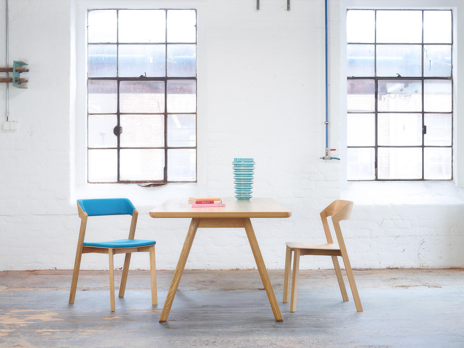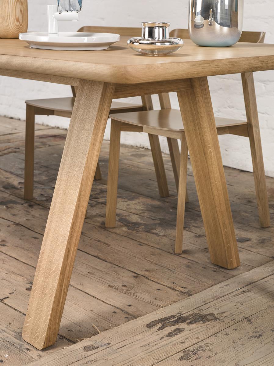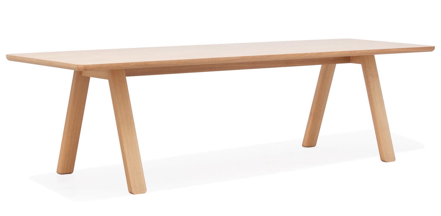 Duży stół z solidnymi nogami, zaokrąglonych krawędziach i ponadczasowym kształcie. Ponieważ nie ma oskrzyni, pasuje nie tylko do krzeseł, ale również foteli, których podłokietniki bez trudu wsuną się pod blat.