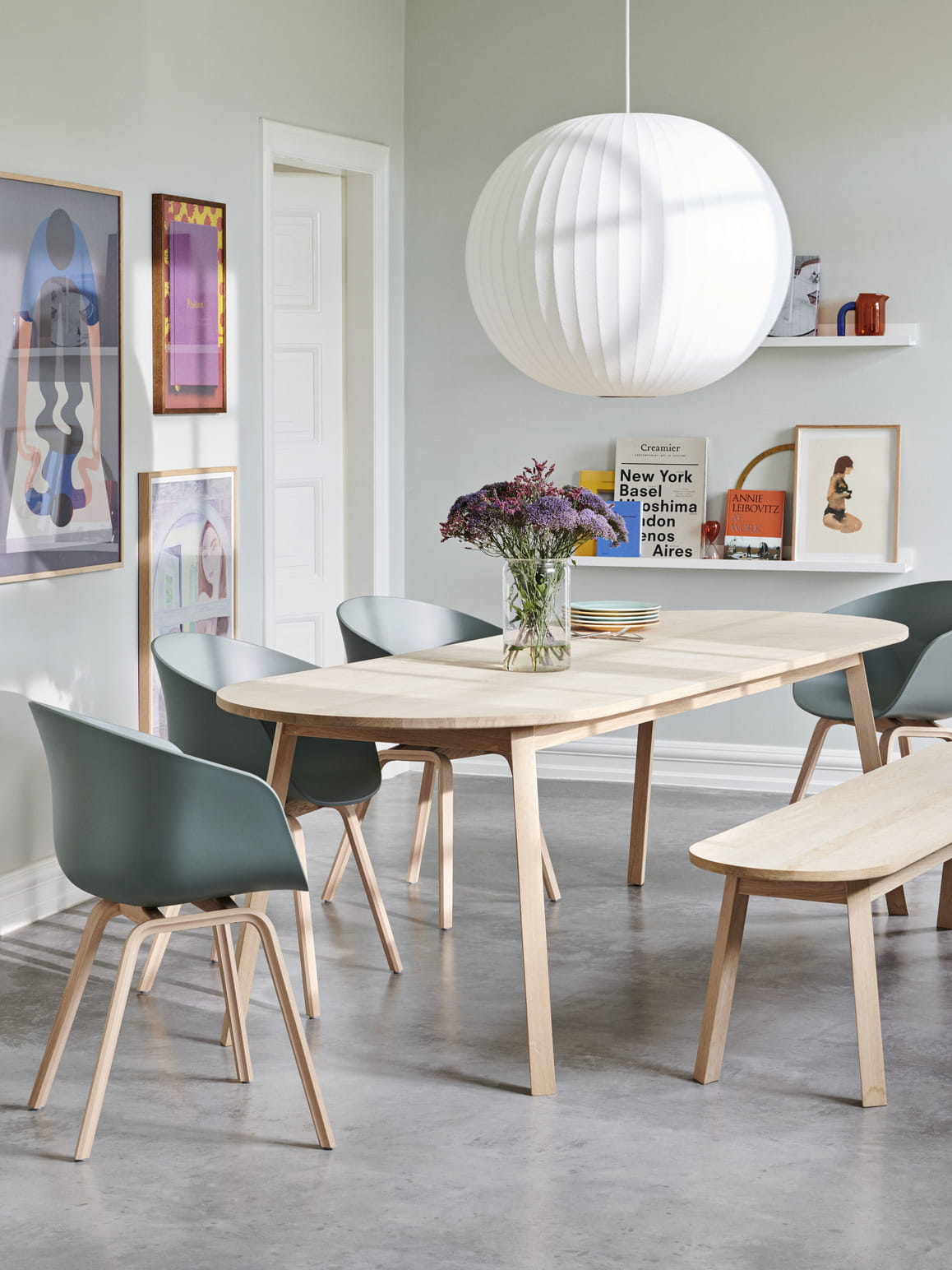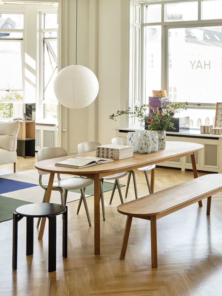 Zmotywowany pragnieniem stworzenia większej przestrzeni wokół okrągłego stołu, Simon Jones zaprojektował serię stołów i ławek Triangle leg. Prostokątne końce blatu i ławki zostały zaokrąglone, tworząc towarzyskie otoczenie, które maksymalizuje liczbę miejsc siedzących wokół stołu. Wykonane z litego drewna dębowego z wykończeniem olejowanym, mydlanym lub lakierowanym bezbarwnie, ta wszechstronna seria nadaje się do wielu prywatnych i publicznych jadalni lub biur.