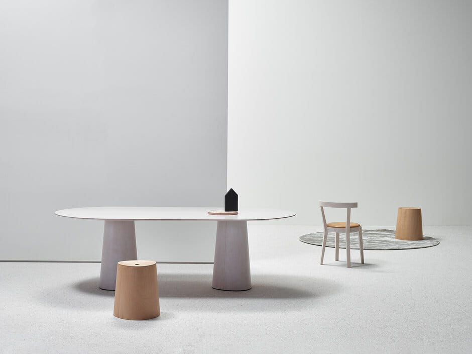 Organiczny kształt i modułowe podstawy. P.O.V. wygląda niepozornie, a jednak może skupić uwagę w każdym pomieszczeniu - zależy to tylko od wybranego kąta widzenia.Prosta podstawa o stożkowatym kształcie, wysokość 73 cm i szerokość 40 cm (podstawy) pozwala na wybór spośród trzech wariantów kształtów.