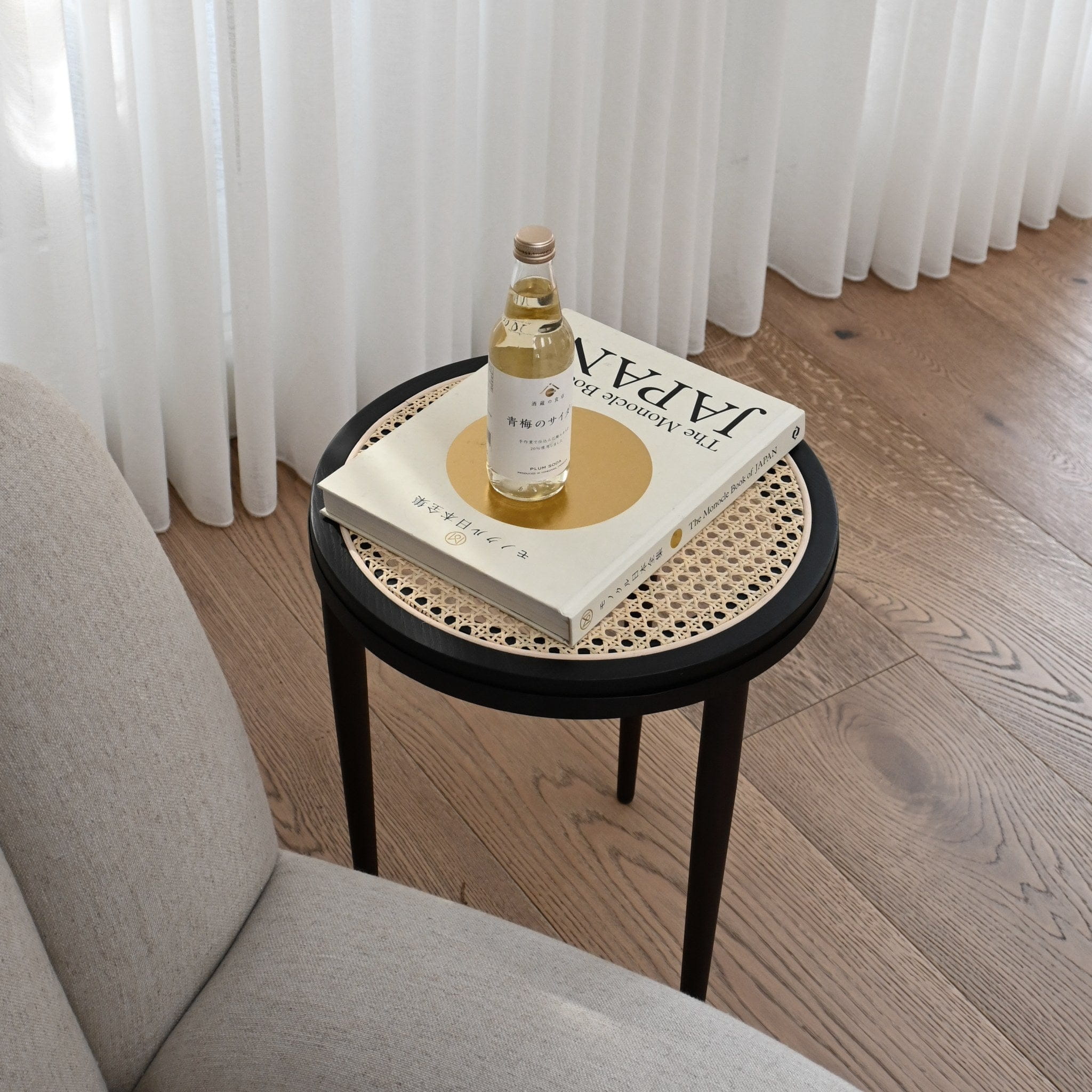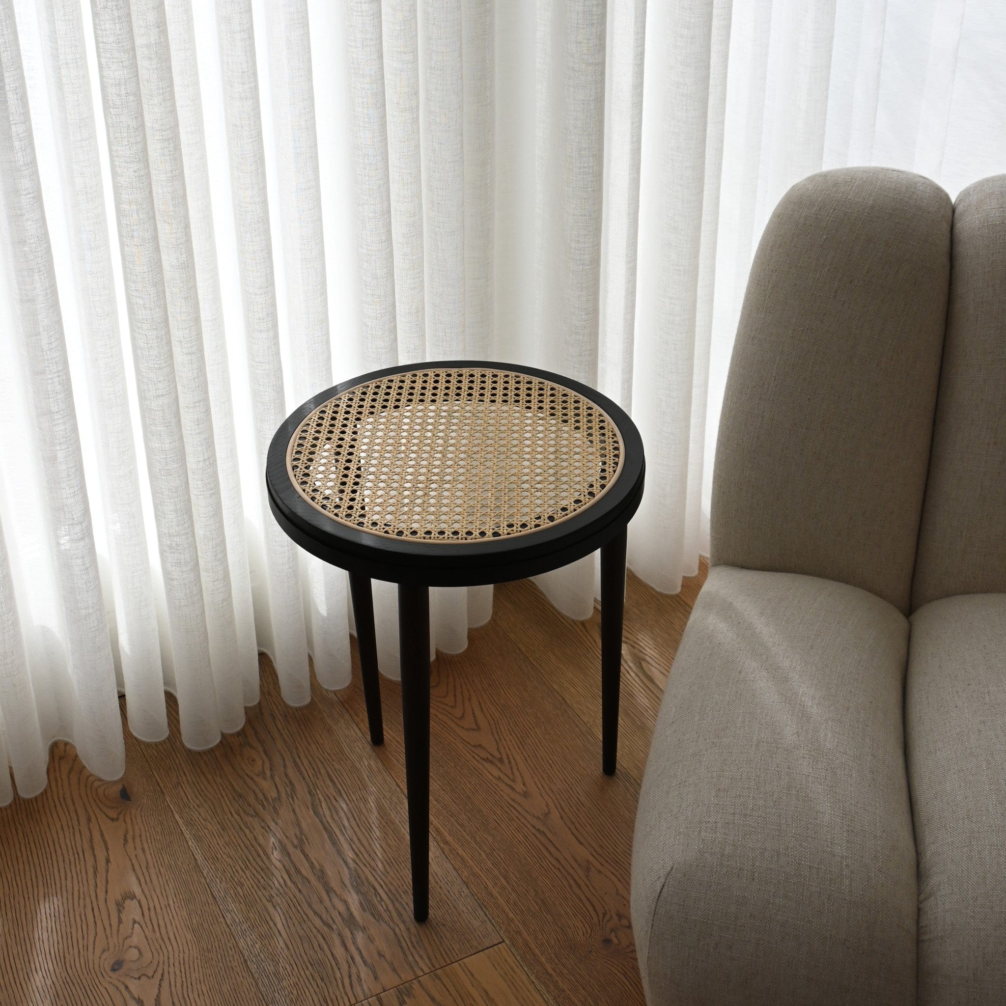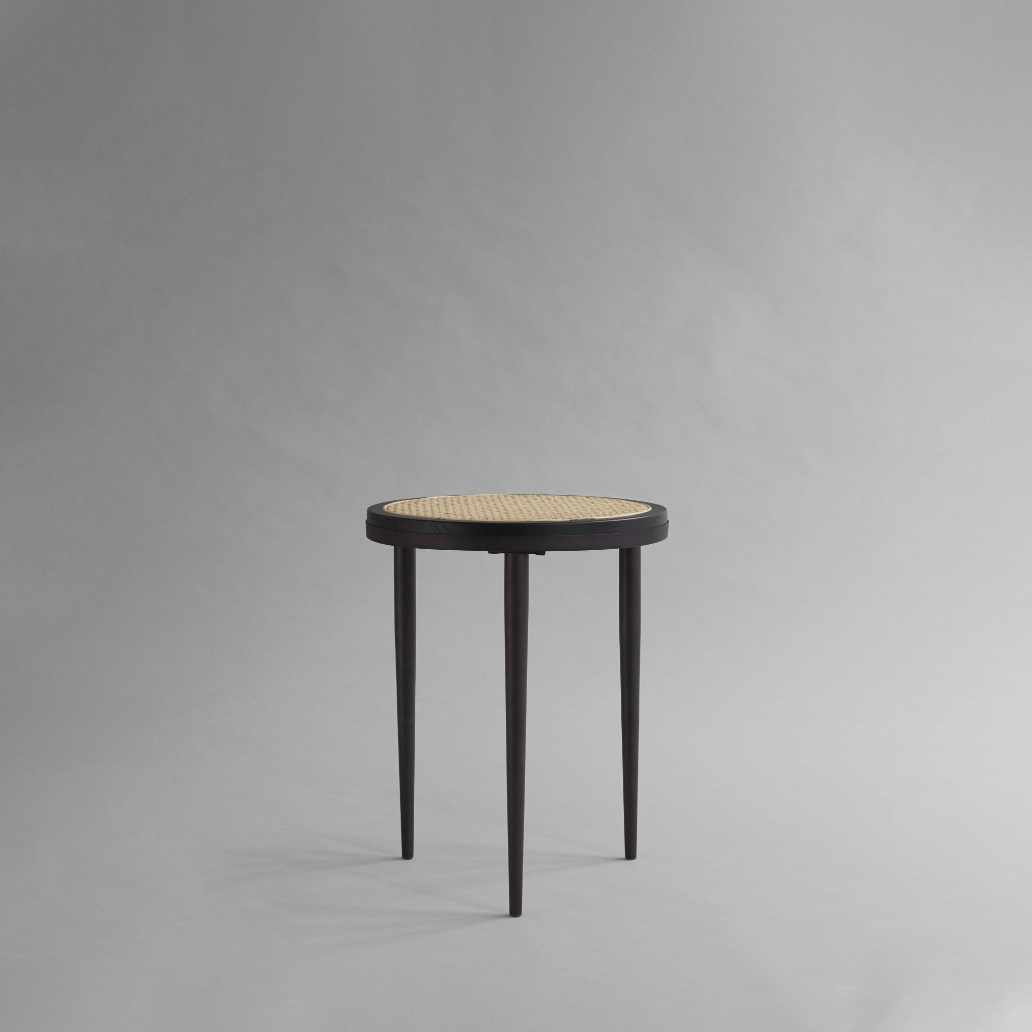 Każdy produkt jest wykonany ręcznie z masywnego jesionu z francuską siatką bambusową, tworząc półprzezroczystą powierzchnię przednią lub górną. Drewniane powierzchnie płynnie przechodzą w metalowe ramy i okucia, tworząc wyrafinowany, nowoczesny wygląd. Charakterystyczne stożkowe nogi i smukła metalowa taca wykonane są z platerowanego metalu.