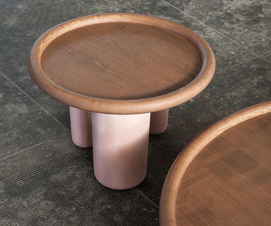 Zaprojektowane przez Studiopepe, stoliki kawowe Pluto to przede wszystkim rzeźbiarskie kształty i odważne detale, które przywodzą na myśl kubizm. Dostępne w dwóch rozmiarach, stoliki składają się z blatu z litego drewna z byczą krawędzią i trzech masywnych betonowych nóg o różnych średnicach, które nadają stolikowi pionowy ruch. W zależności od perspektywy widza, jego wygląd wydaje się zmieniać.