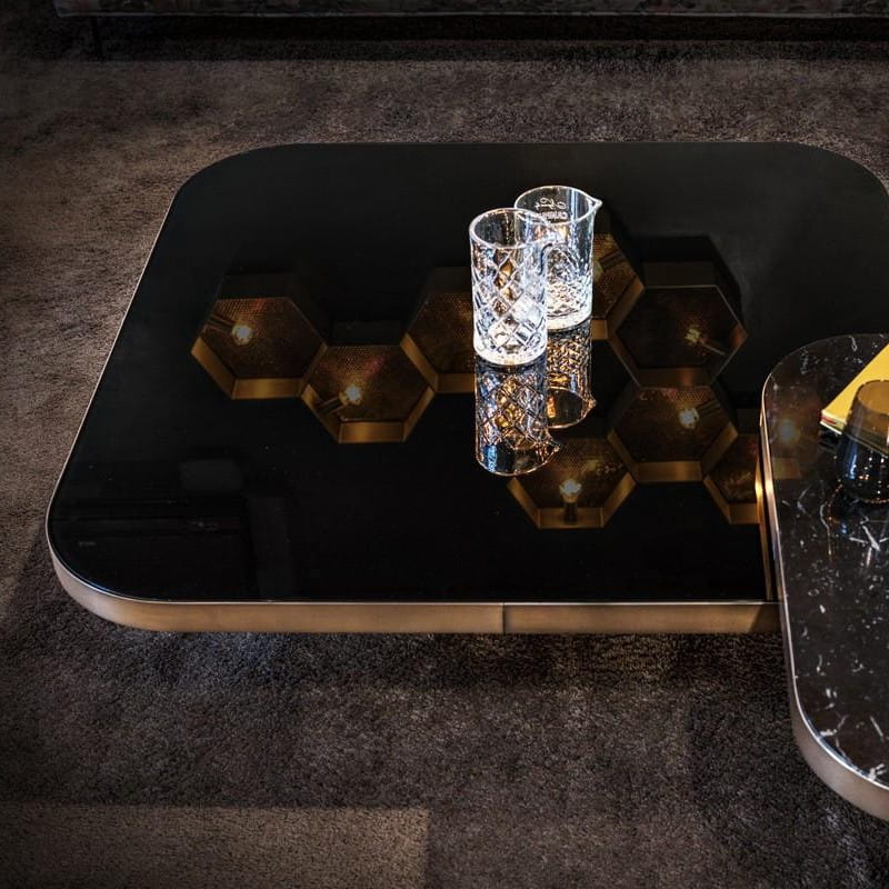 Blat może być w wersji z czarnym szkłem lub marmurem Nero Marguina, Emperador Dark lub Bianco Carrara.