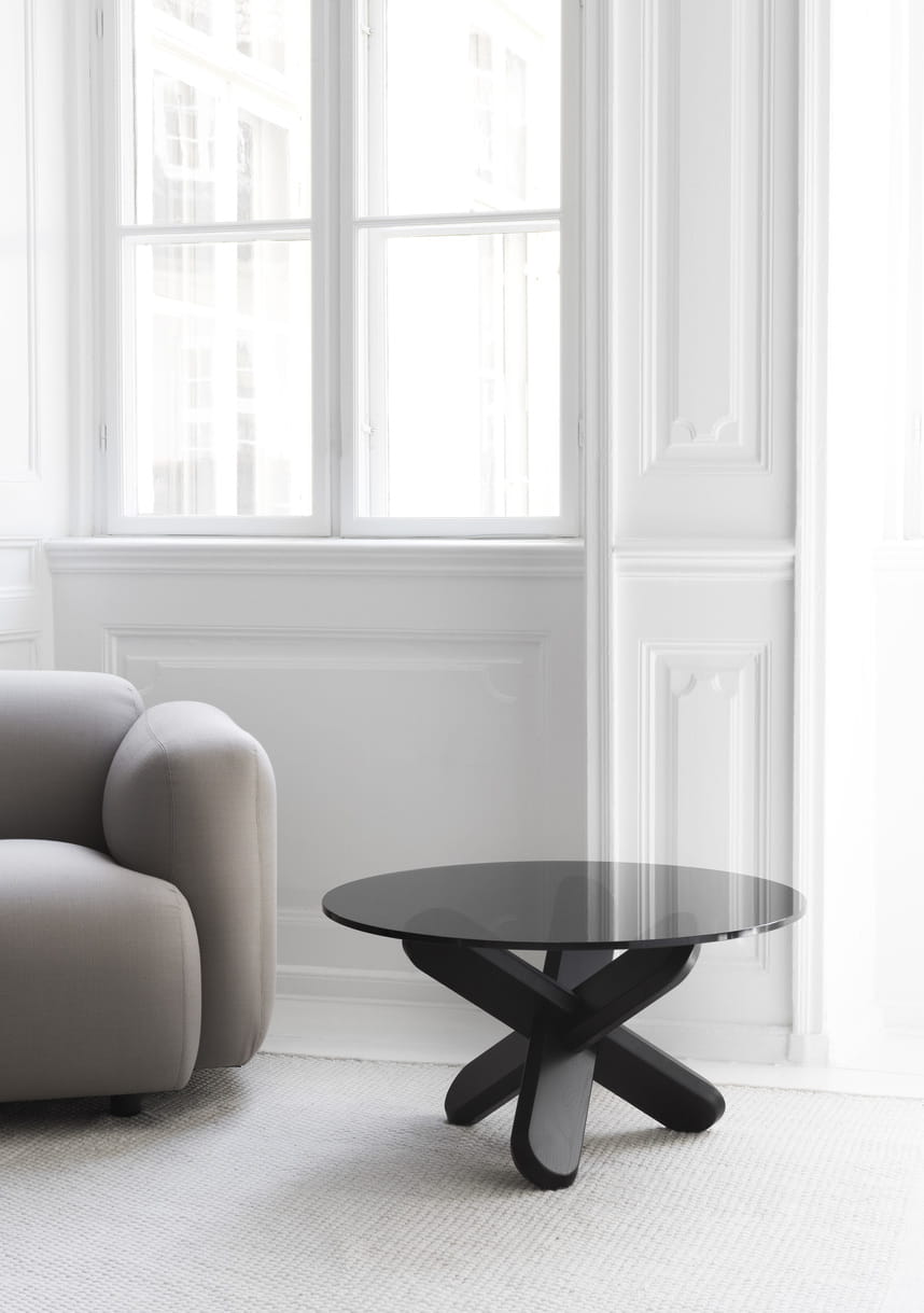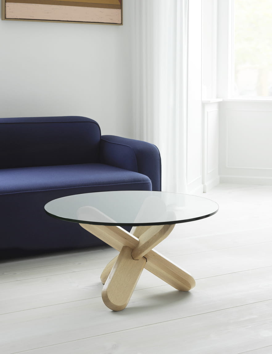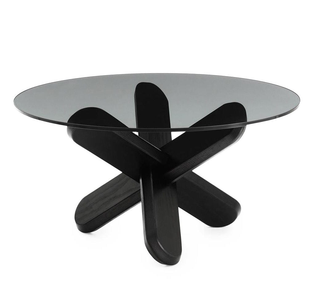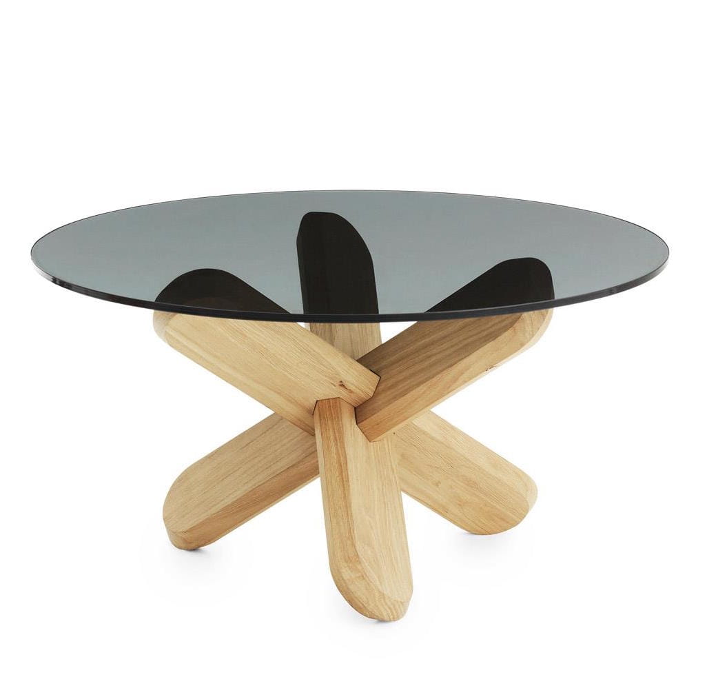 Stół Ding jest inspirowany starożytnymi, trójwymiarowymi, drewnianymi łamigłówkami. Stół składa się po prostu z trzech nóg wykonanych z drewna dębowego, które montuje się bez użycia śrub i jakichkolwiek narzędzi. Po złożeniu tworzą one rzeźbiarski węzeł, który działa jako podstawa dla ekskluzywnego szklanego blatu. Nogi zakończone są fazowanymi krawędziami, dzięki czemu stół stoi stabilnie na podłodze, a okrągła tafla szkła spoczywa solidnie na podstawie. Stół Ding jest dostępny z przezroczystym lub przydymionym szklanym blatem, a dzięki dwóm różnym rodzajom nóg można znaleźć styl, który będzie pasował do umeblowania i gustu. Można na przykład połączyć przezroczysty szklany blat z nogami w kolorze naturalnym, uzyskując czysty i skandynawski wyraz, lub podkręcić intensywność za pomocą przydymionego blatu lub efektownych czarnych nóg.