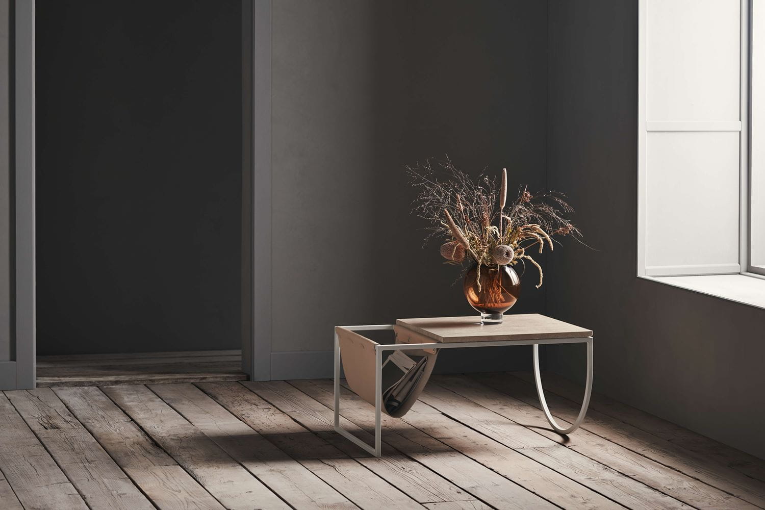 Niemiecki Joa Herrenknecht projektuje meble z zabawnym i dociekliwym podejściem zarówno do języka projektowania, jak i doboru materiałów. W efekcie powstał Piero, piękny, funkcjonalny i wyrafinowany stolik kawowy, w którym wiele geometrycznych kształtów i alternatywnych, naturalnych materiałów jest ostro i pięknie zestawionych ze sobą. Skórzaną kieszeń można również zapinać i zdejmować, co nadaje projektowi świeży, nowy wygląd.